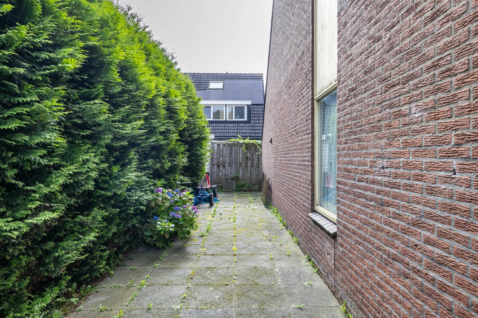 De grote achtertuin met een vrijstaande houten berging biedt volop privacy en heeft ook een achterom.