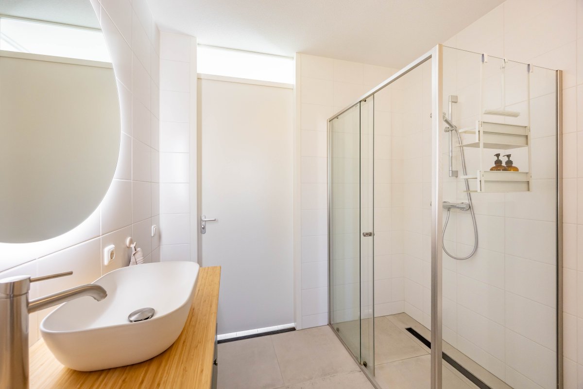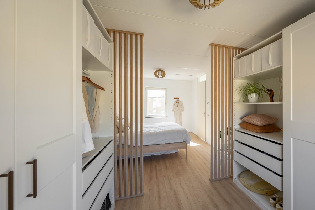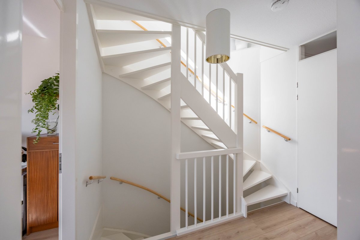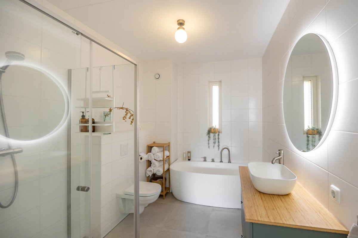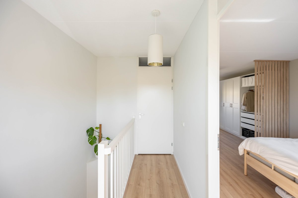 Op de eerste verdieping vind je via de ruime overloop drie lichte slaapkamers van respectievelijk circa 6m², 13m² en 14m². De luxe badkamer, beschikt over een half vrijstaand ligbed, douchehoek, wastafelmeubel en een tweede toilet.