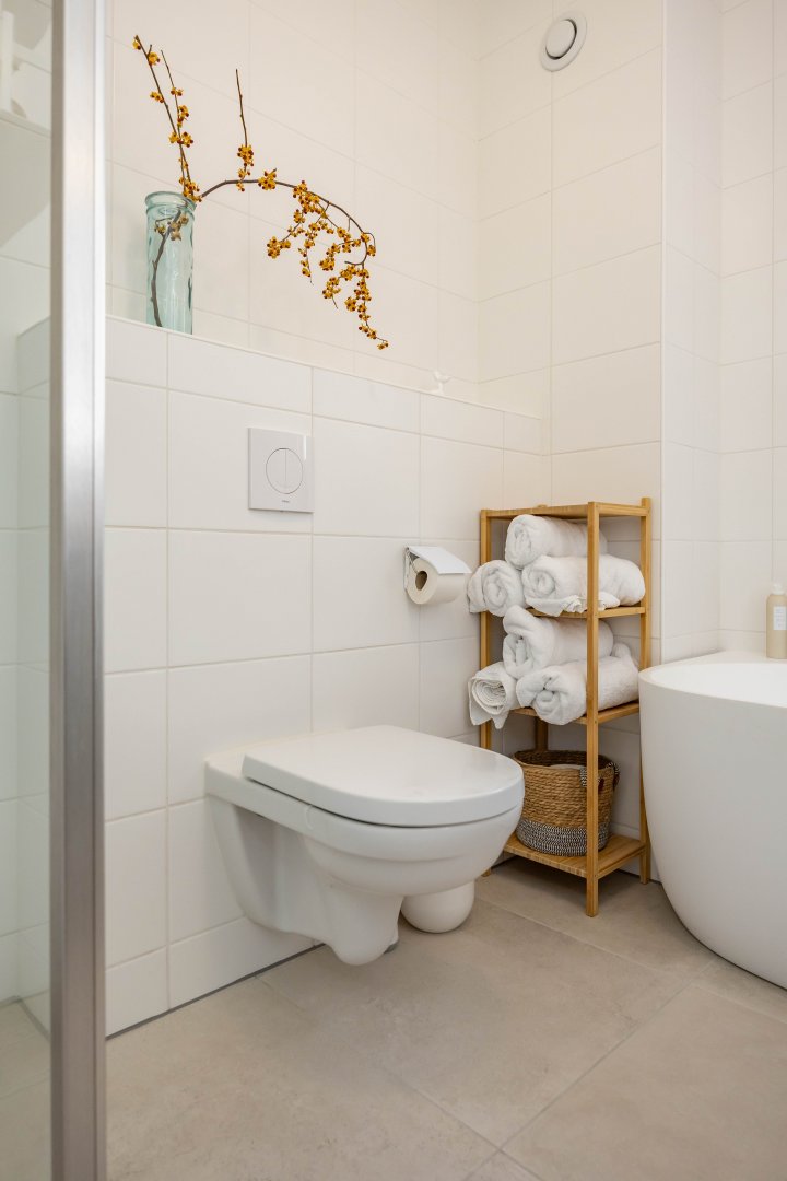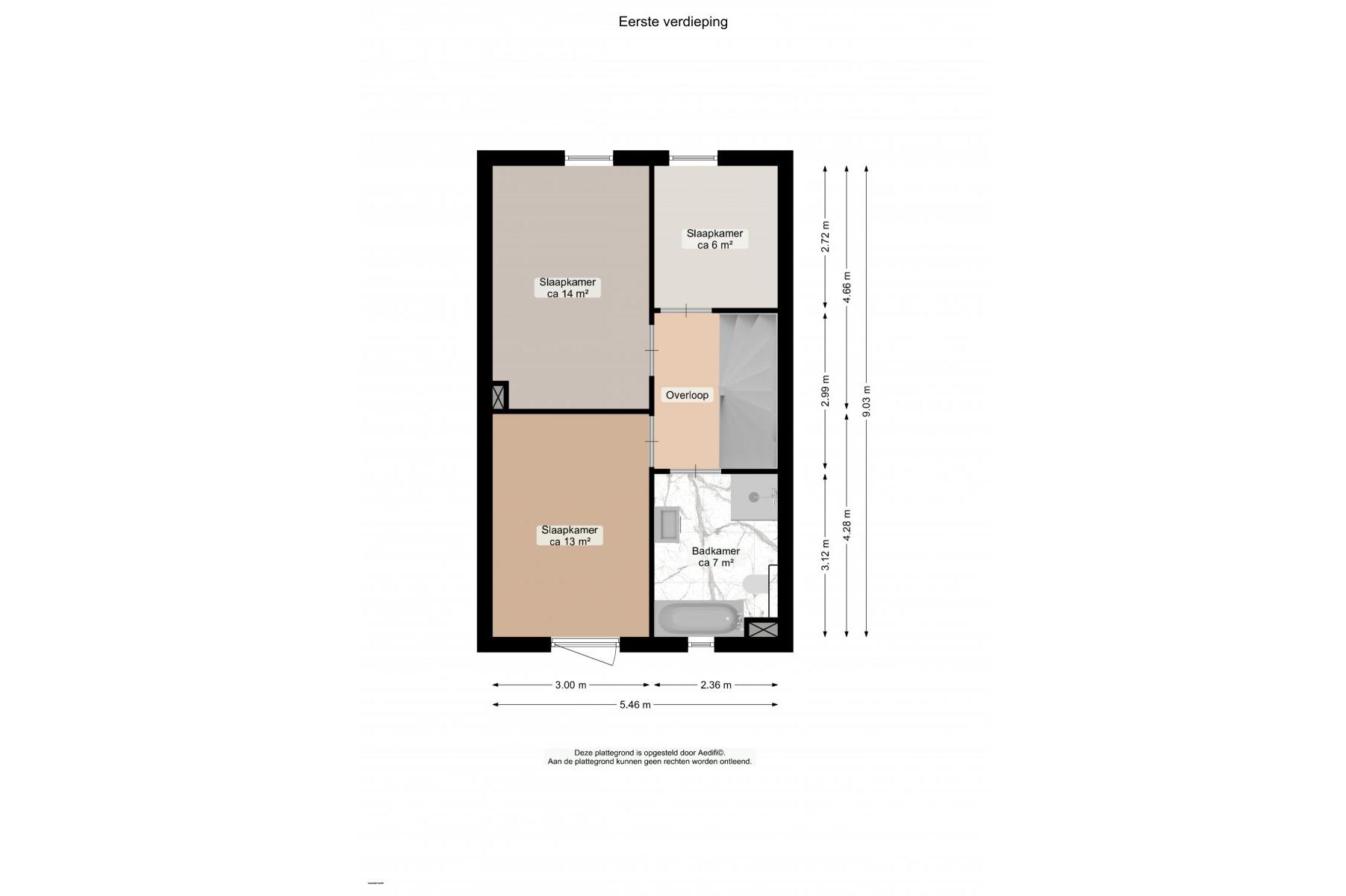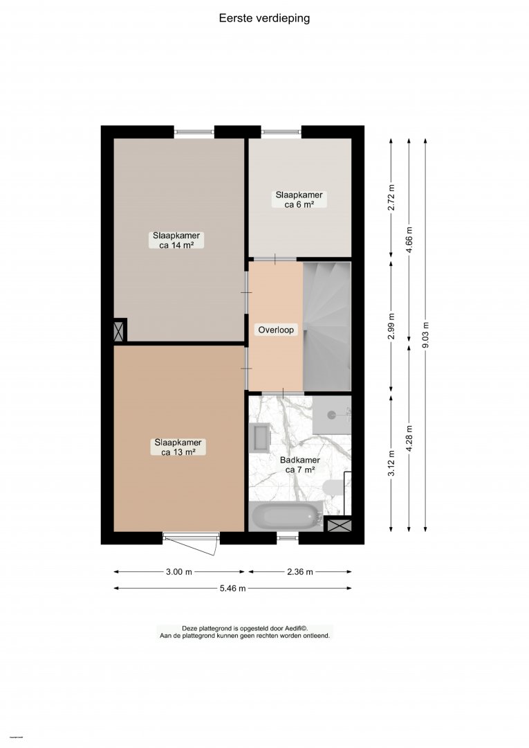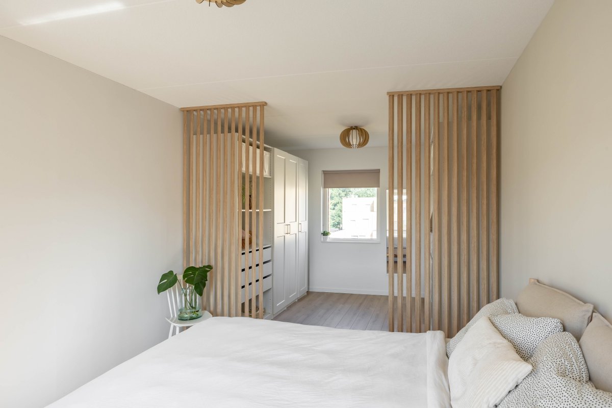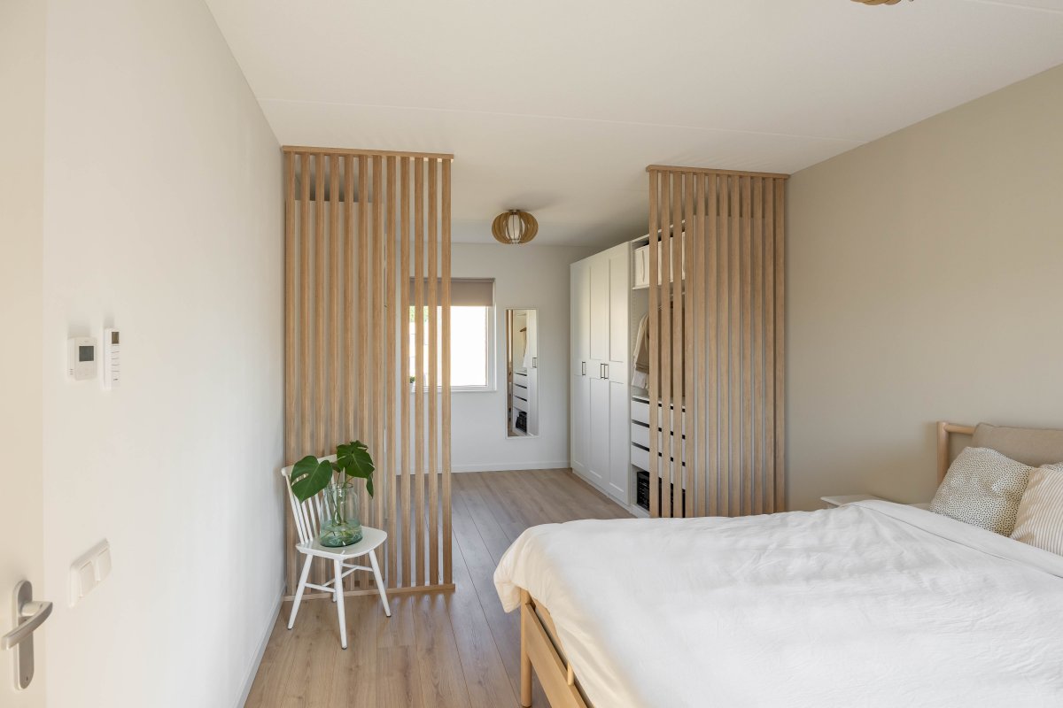Op de eerste verdieping vind je via de ruime overloop drie lichte slaapkamers van respectievelijk circa 6m², 13m² en 14m². De luxe badkamer, beschikt over een half vrijstaand ligbed, douchehoek, wastafelmeubel en een tweede toilet.