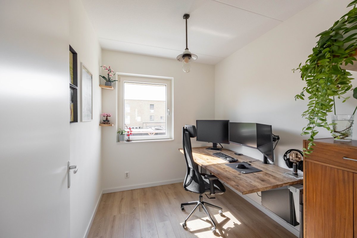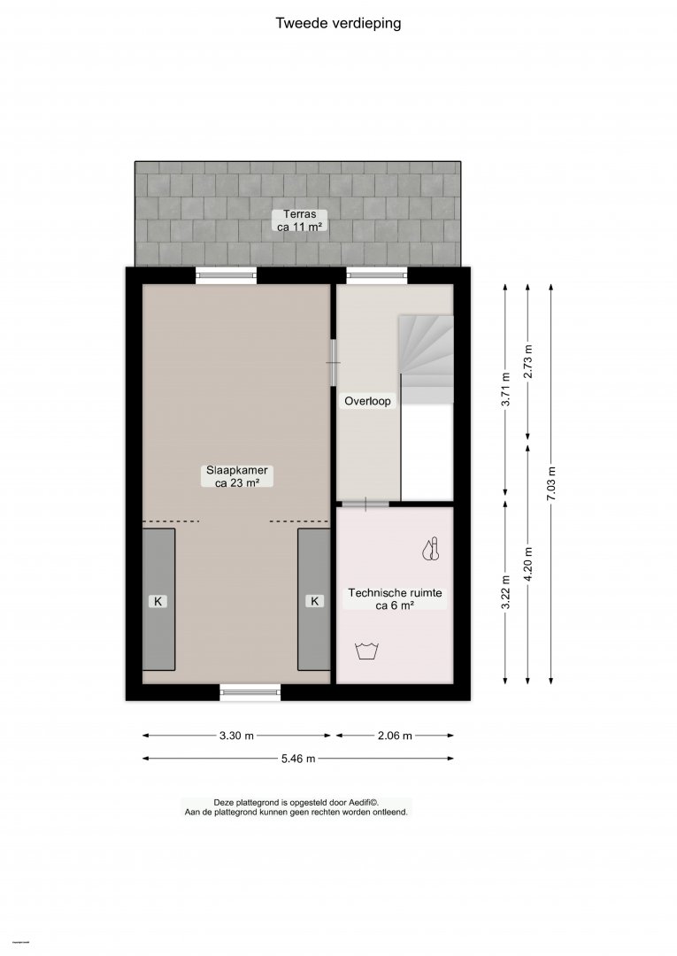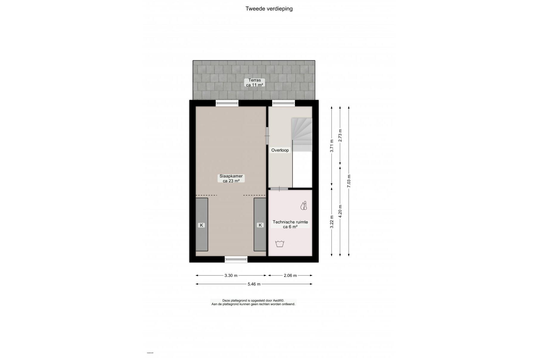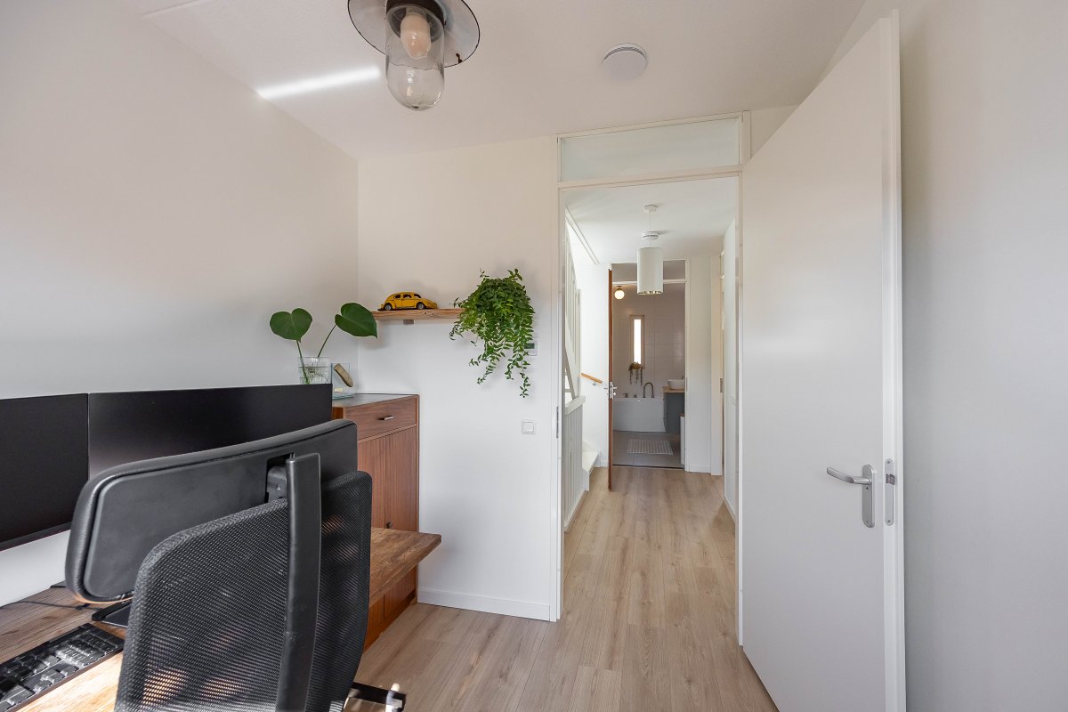 De tweede verdieping, te bereiken via een vaste trap, biedt een multifunctionele ruimte of vierde slaapkamer van circa 23m². Ook bevindt zich hier de technische ruimte met witgoedaansluitingen en kan er een dakterras gerealiseerd worden.