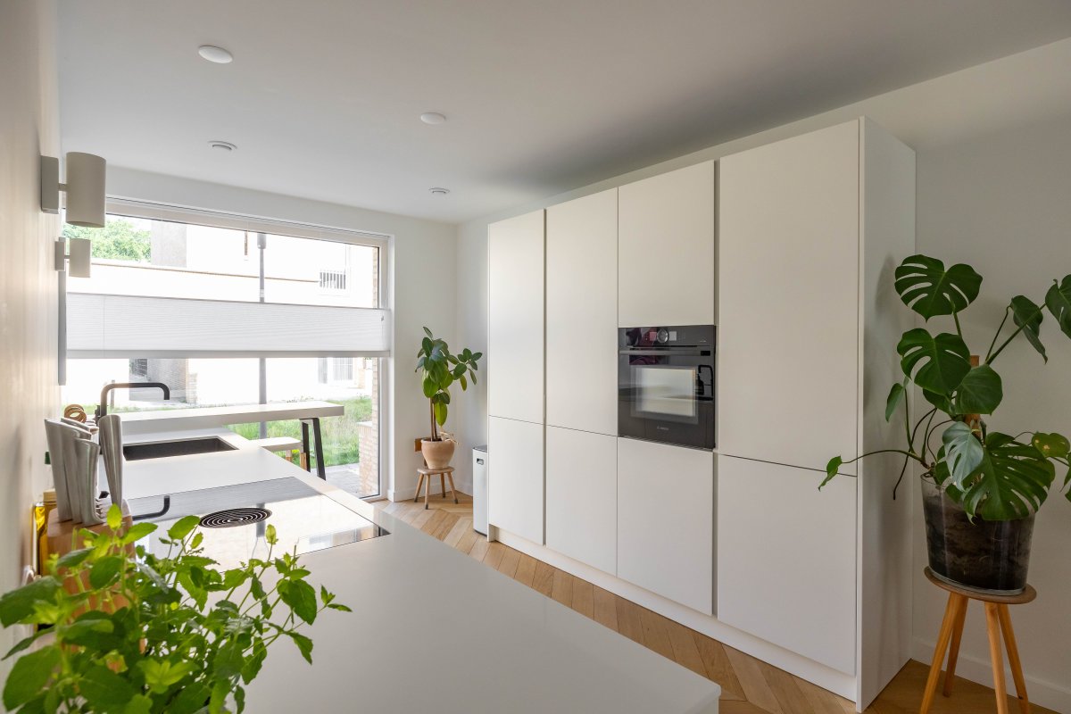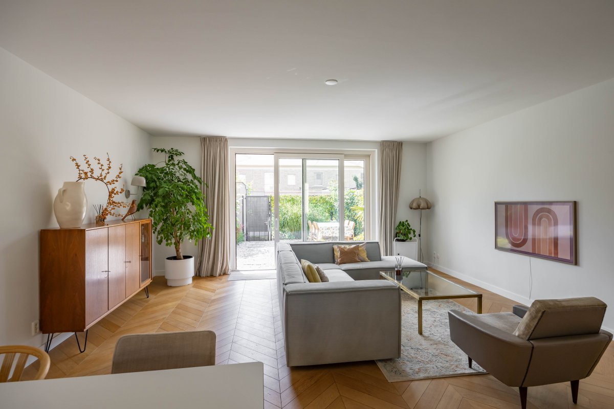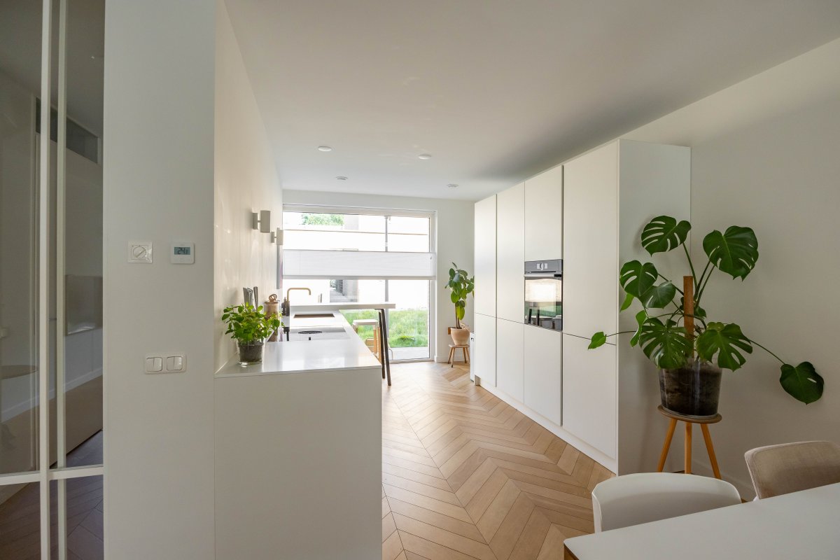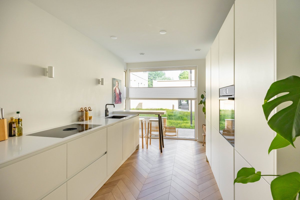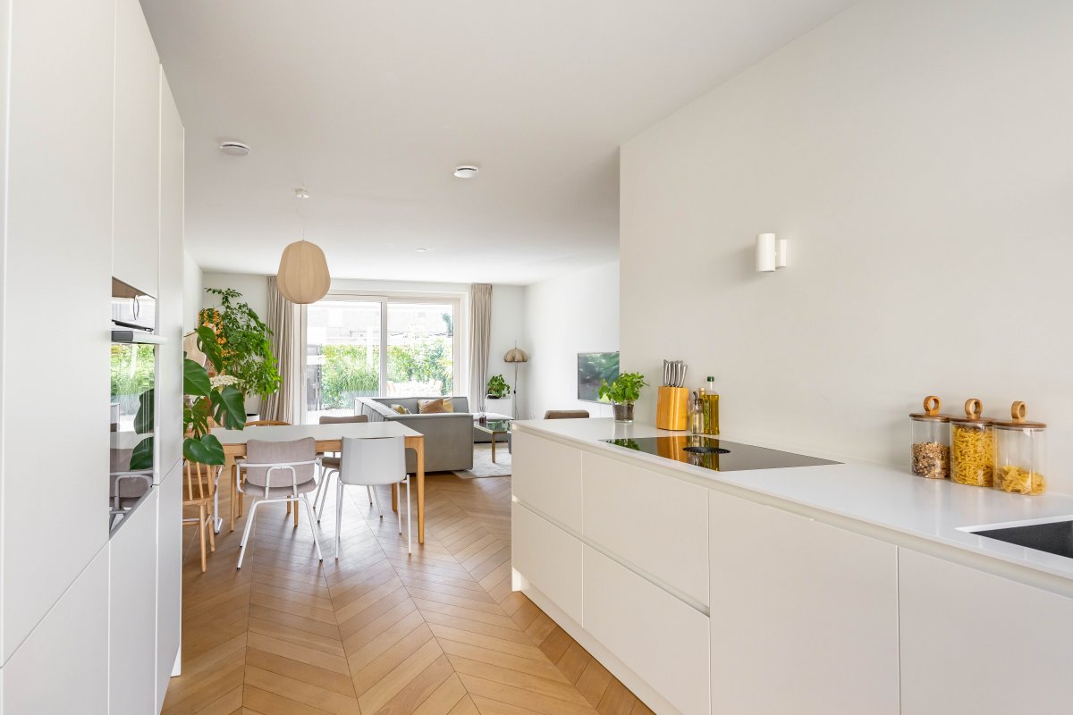 Via de hal betreed je, door een witte metalen taatsdeur, de royale, tuin-gerichte living met open keuken en schuifpui.