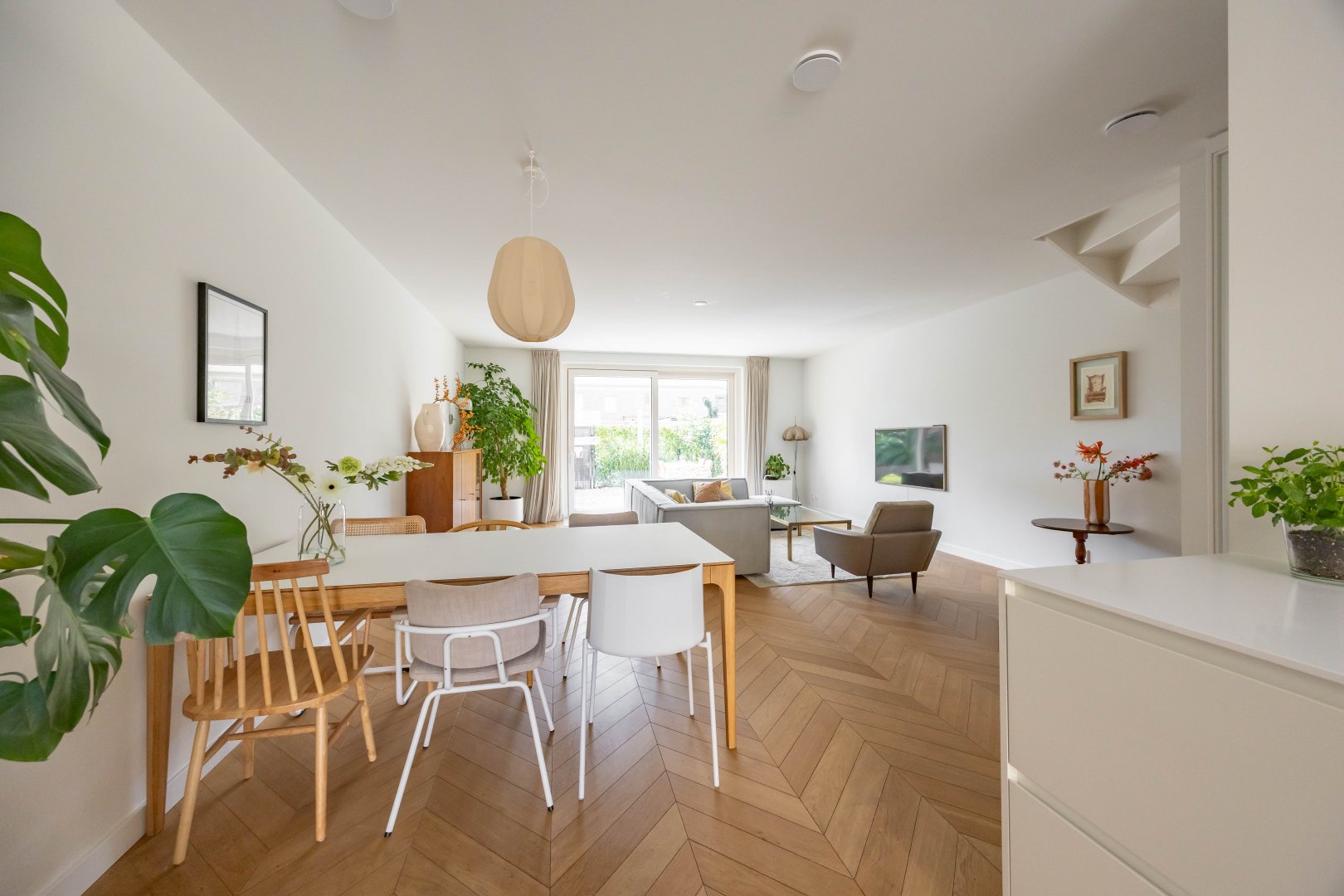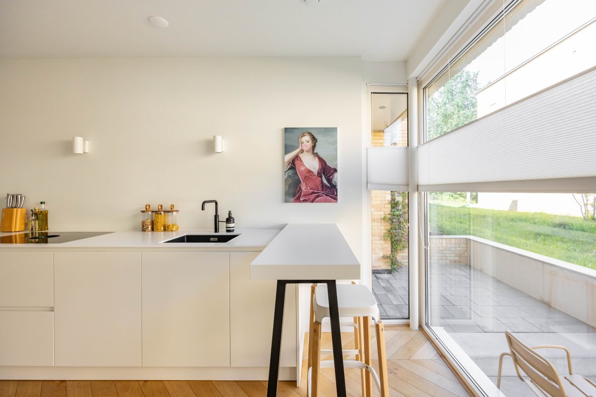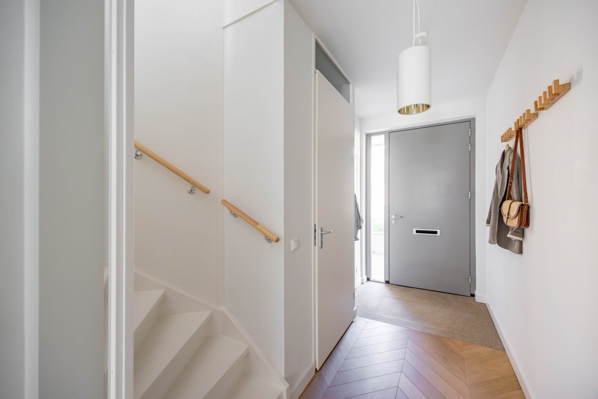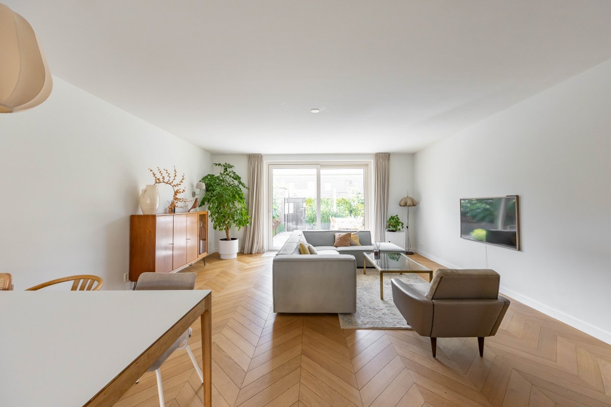 Via de hal betreed je, door een witte metalen taatsdeur, de royale, tuin-gerichte living met open keuken en schuifpui.
