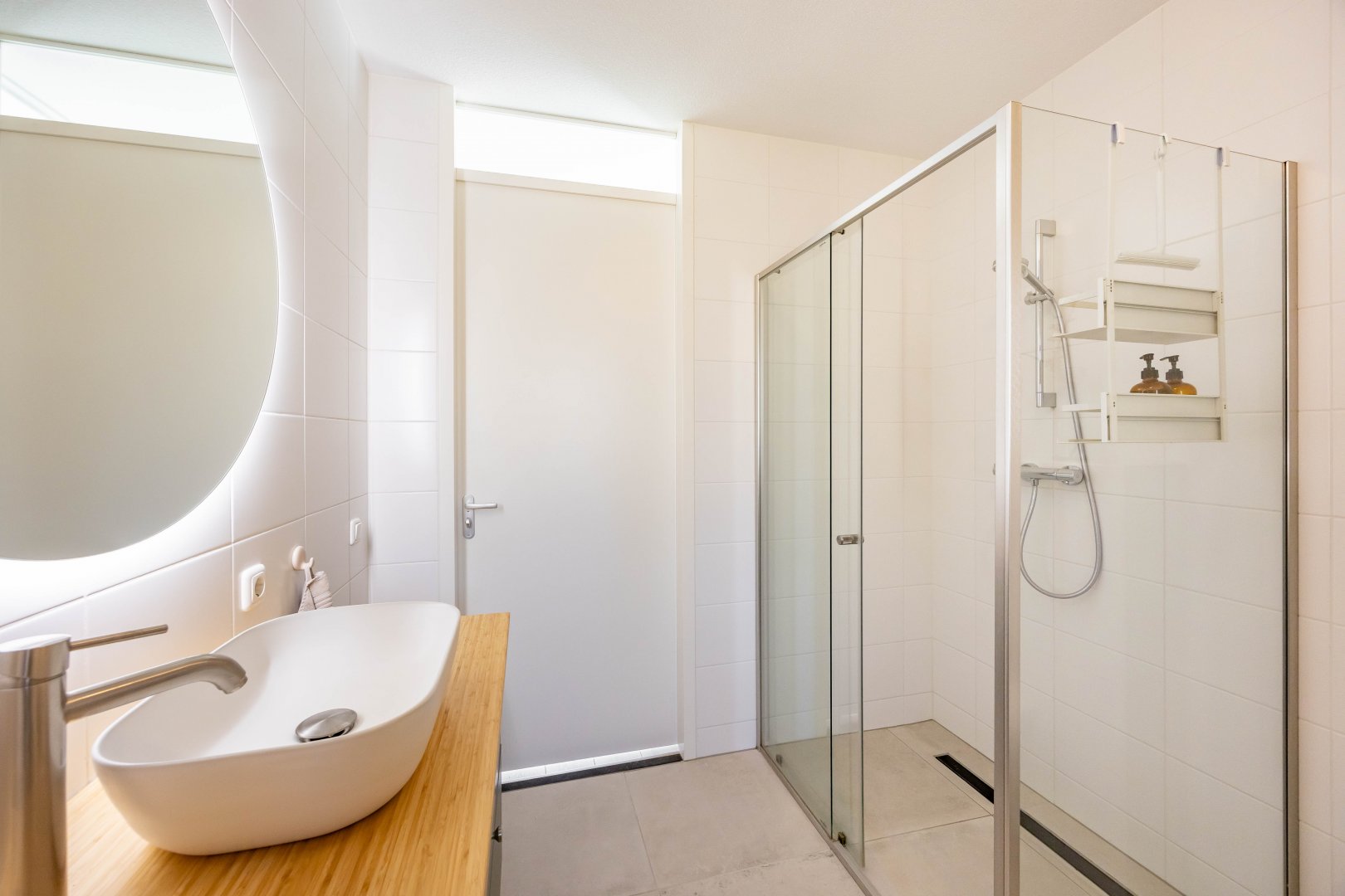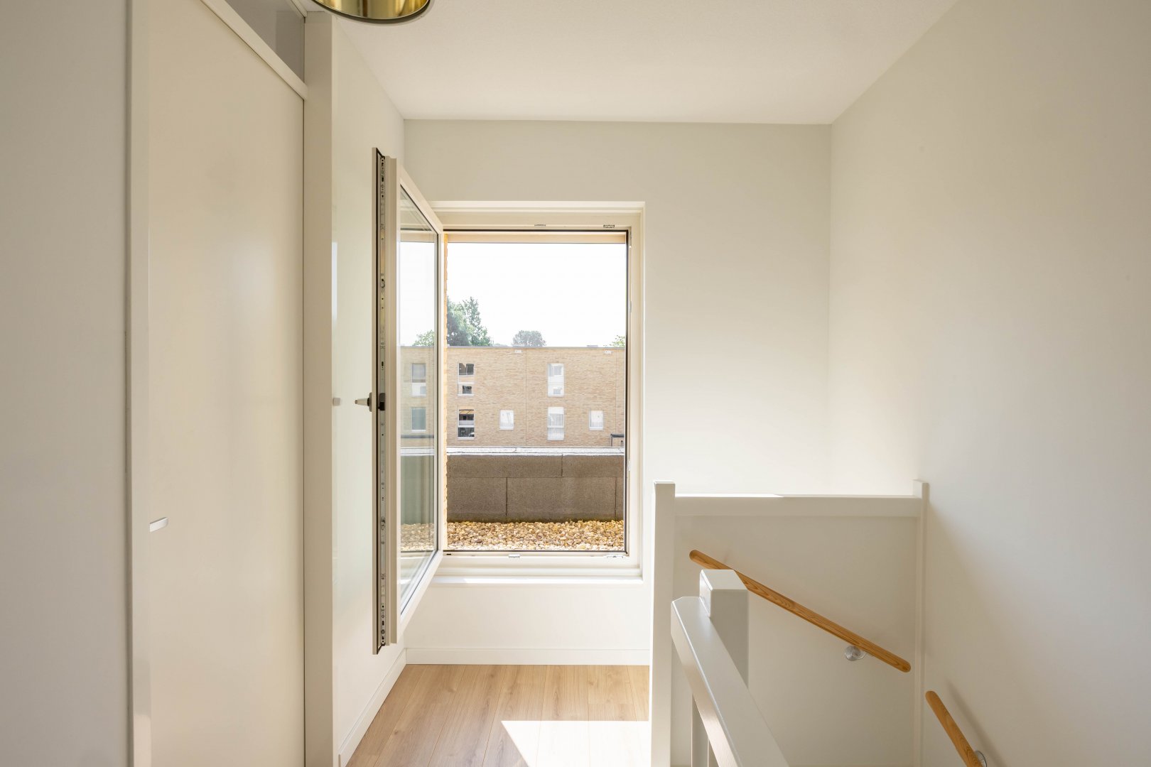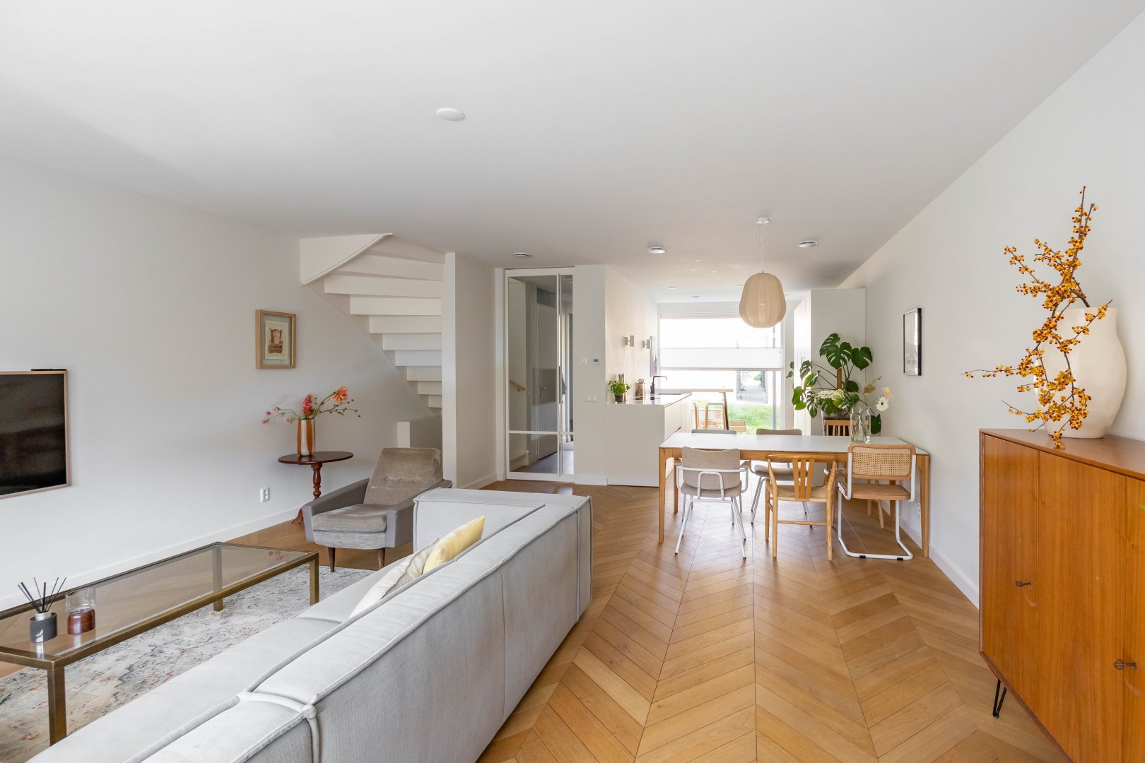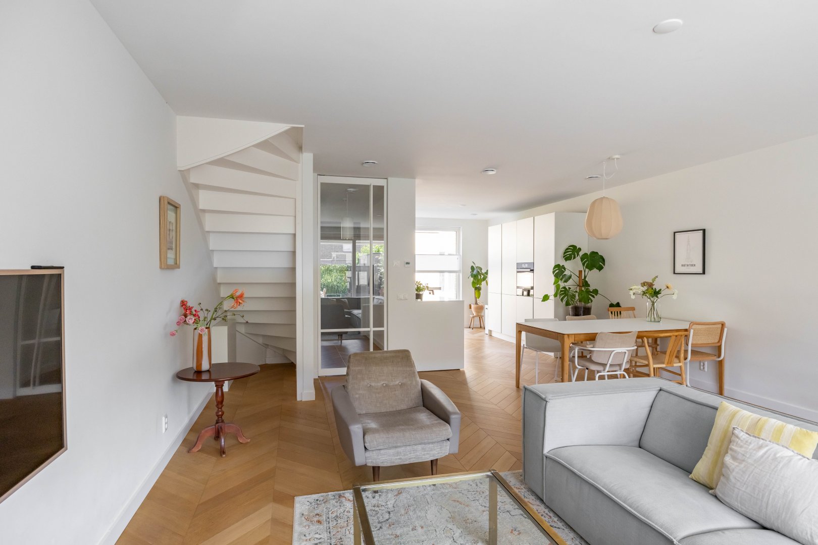 Via de hal betreed je, door een witte metalen taatsdeur, de royale, tuin-gerichte living met open keuken en schuifpui.