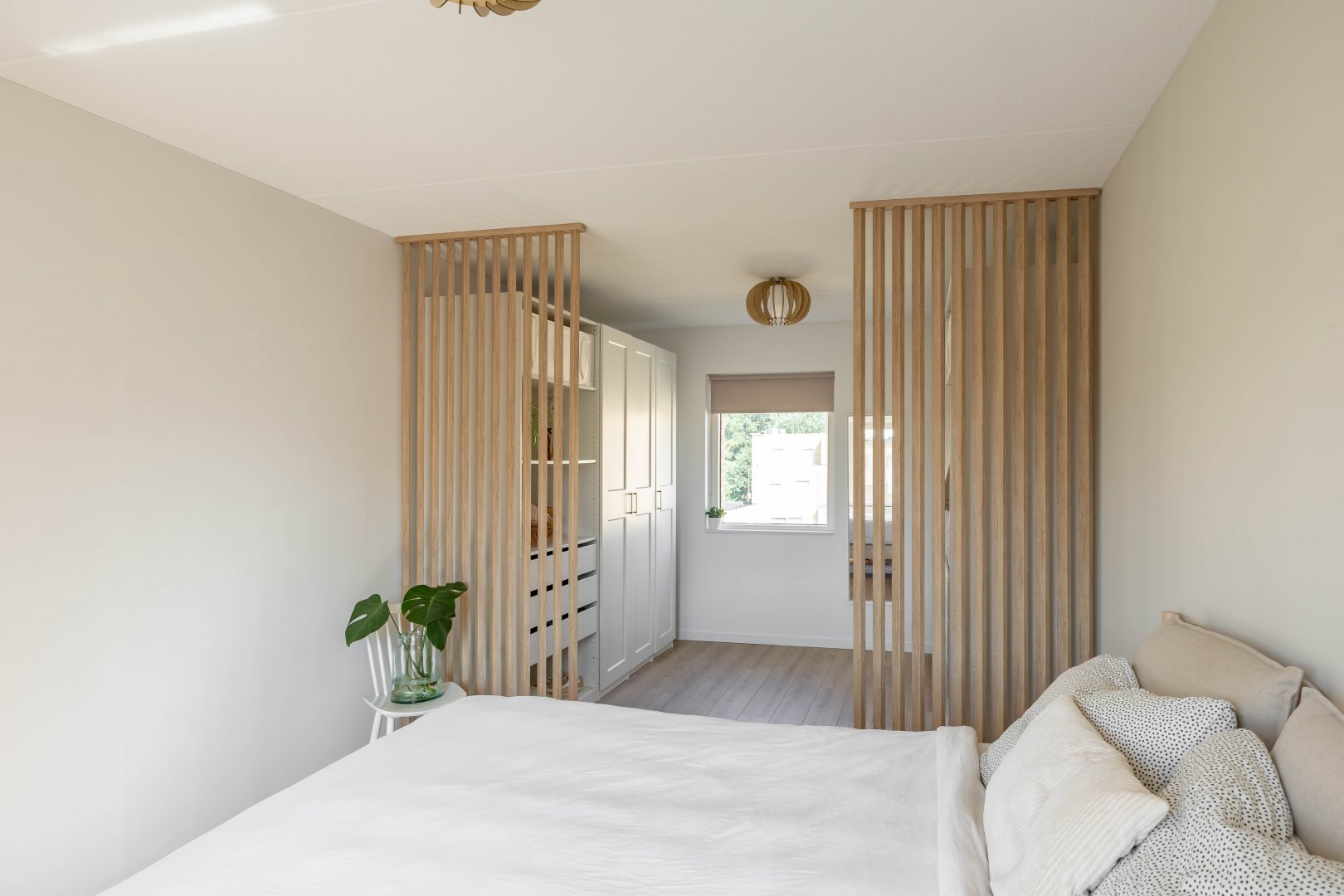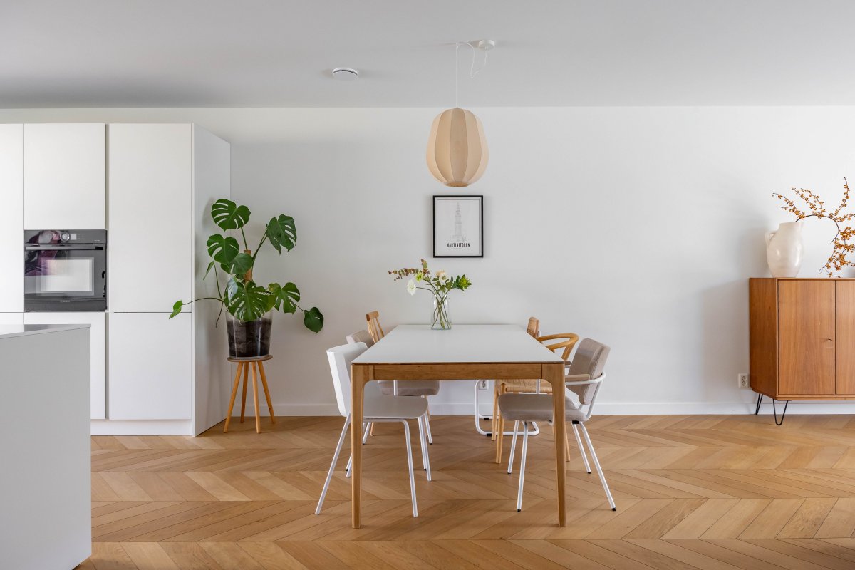 Op de vloer ligt parket van eikenhout in Hongaarse punt.
