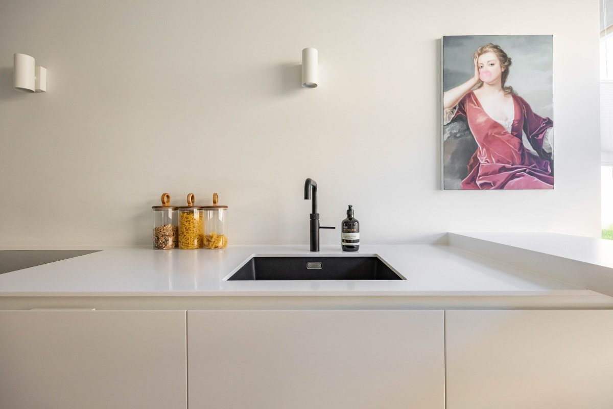De strakke Italiaanse "DOIMO CUCINE" keuken is van alle moderne gemakken voorzien zoals een Bora inductiekookplaat, een Quooker en hoogwaardige Bosch inbouwapparatuur.