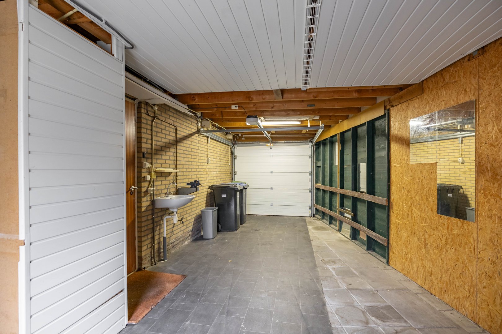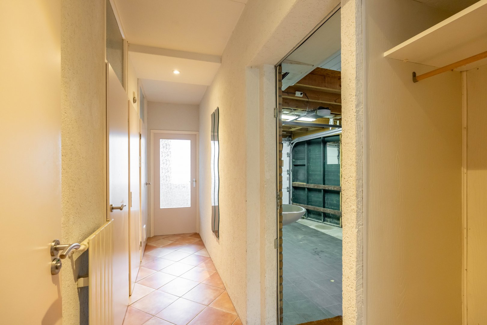 entree/hal; gang met daaraan toilet en wasruimte; L-vormige tuingerichte woonkamer met halfopen keuken, totaal circa 43 m²; vanuit gang is de garage (28m²) bereikbaar;