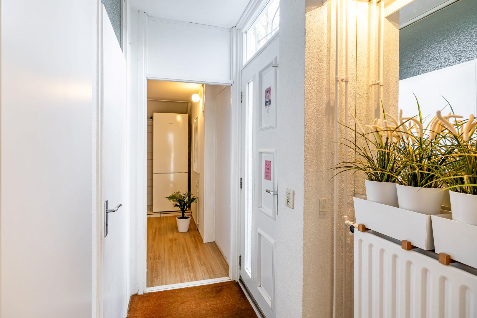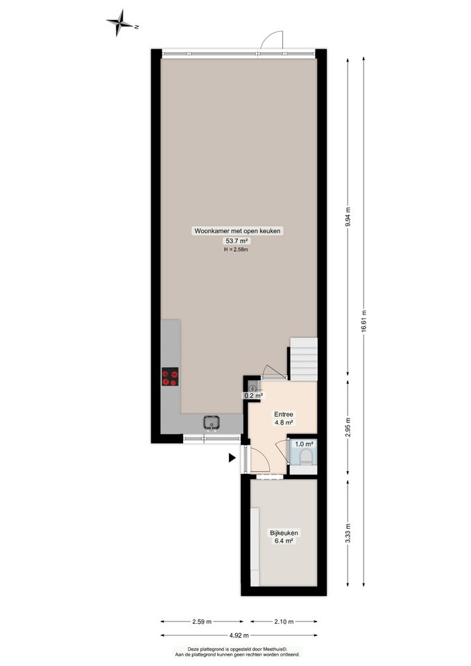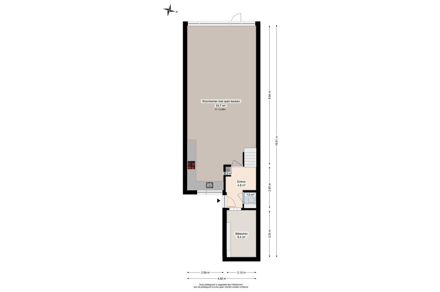 entree; hal; toiletruimte; bijkeuken/berging; woonkamer met open keuken, totaal circa 54 m²; deur naar achtertuin op het westen;