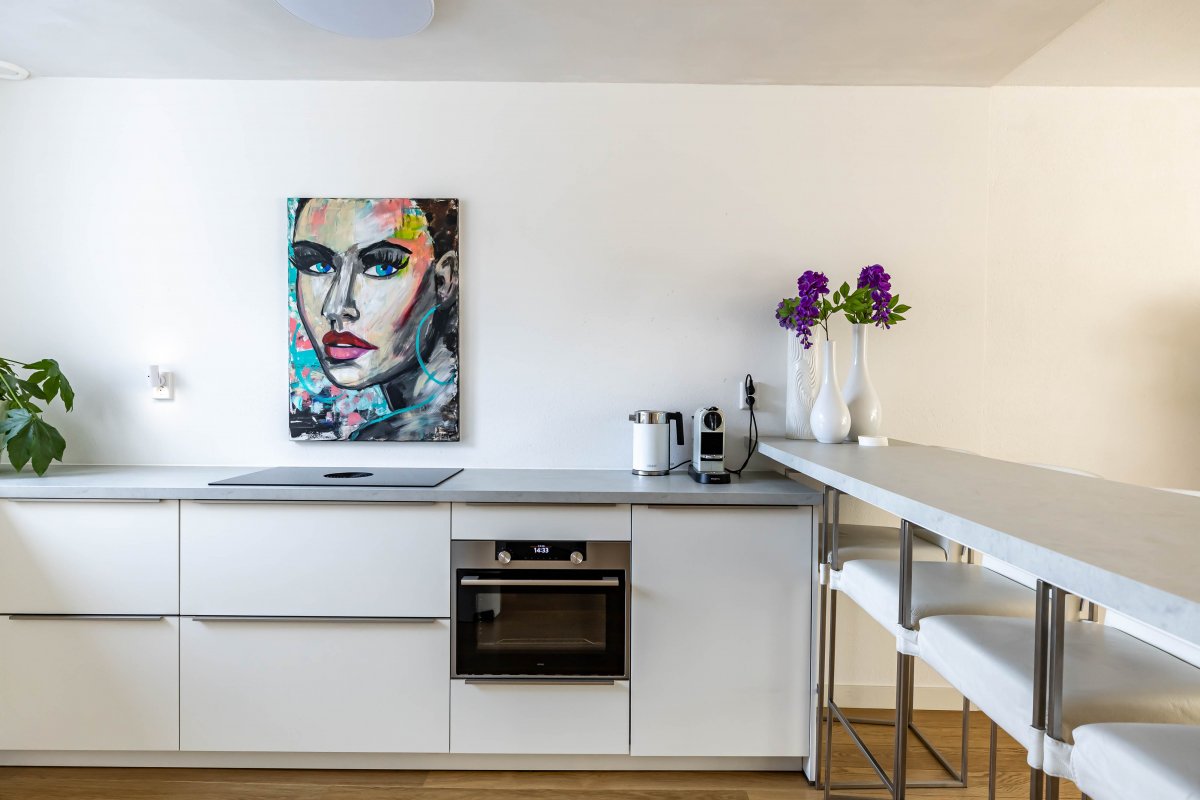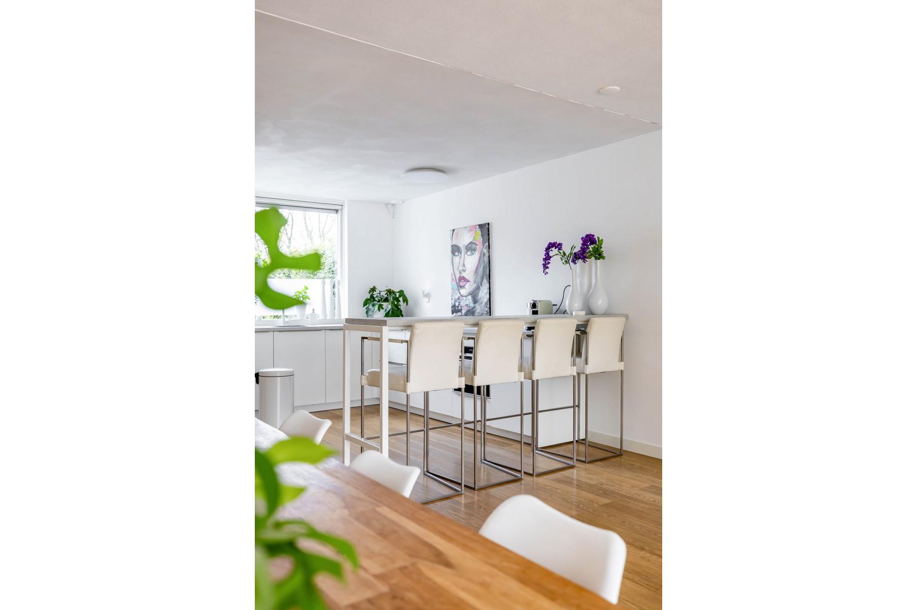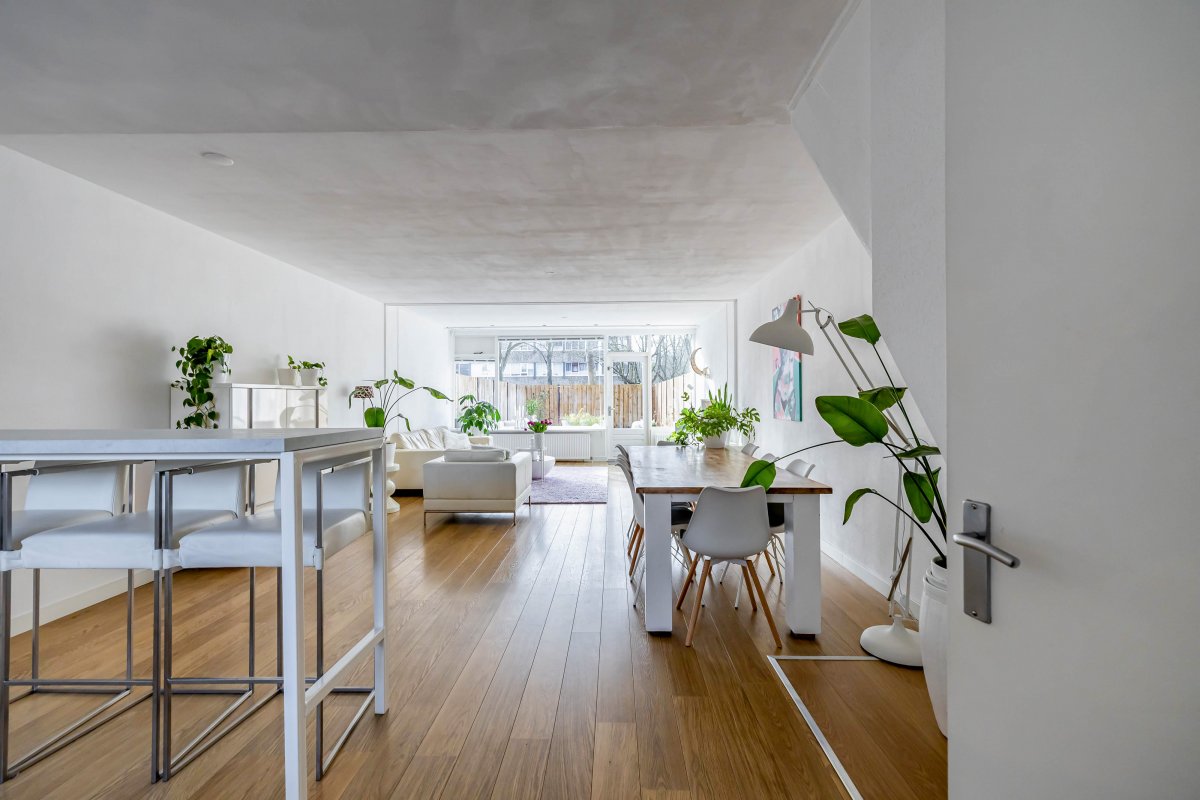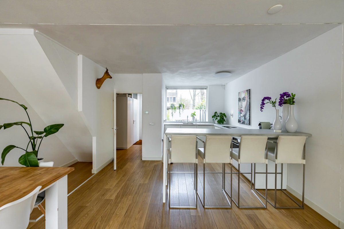 De woonkamer is uitgebouwd waardoor er een fantastische, ruime living (circa 54 m²) met open keuken is ontstaan. Er is ruimte voor een extra grote eettafel en een royaal, tuingericht zitgedeelte. Bij binnenkomst in de woonkamer is de moderne, strakke open keuken uit 2022 een absolute eyecatcher! De lichte wandafwerking geeft het geheel een zeer moderne en stijlvolle uitstraling.