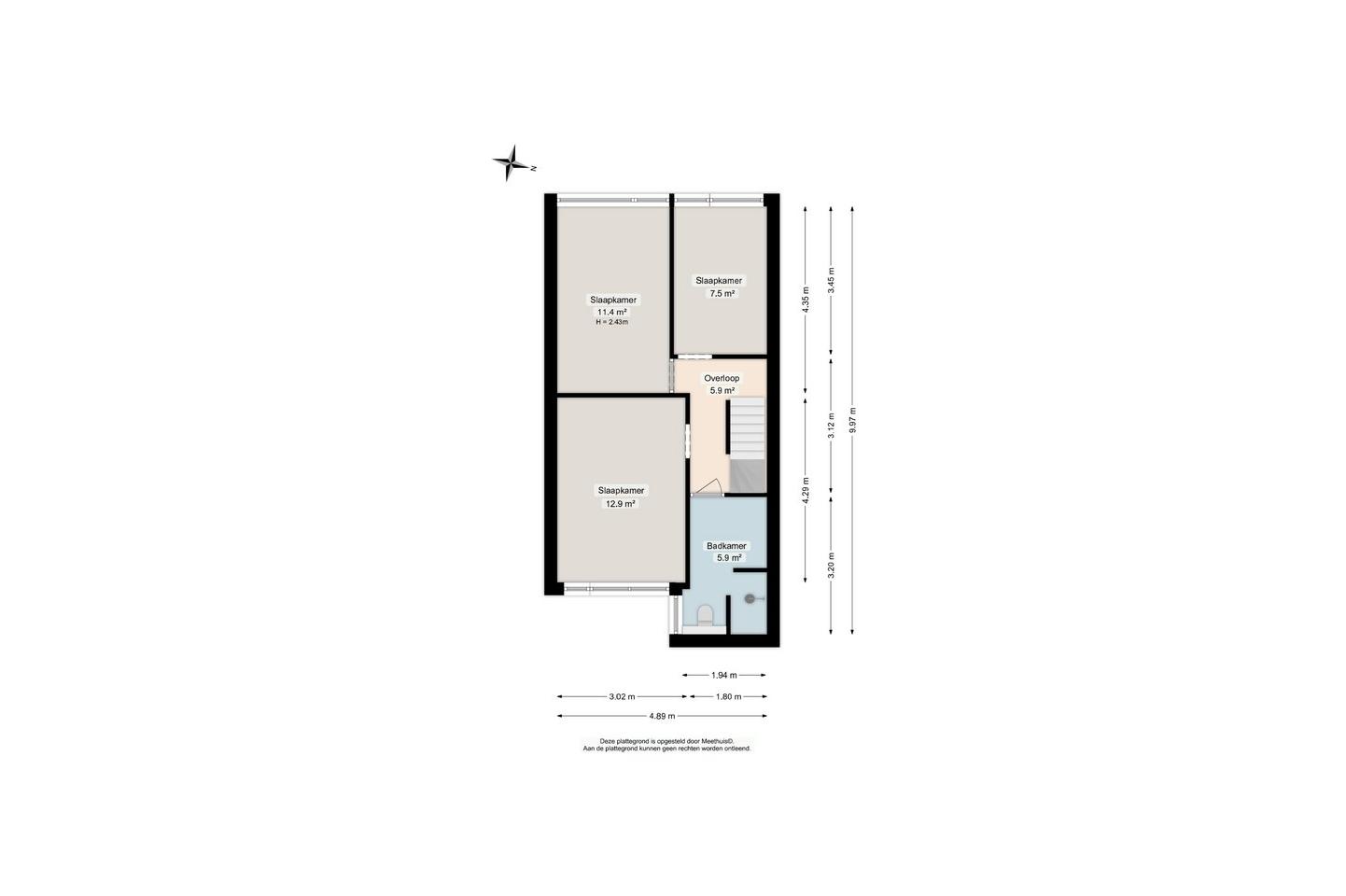overloop; drie slaapkamers van respectievelijk circa 8, 11 en 13 m²; badkamer met toilet; douche en wastafel;