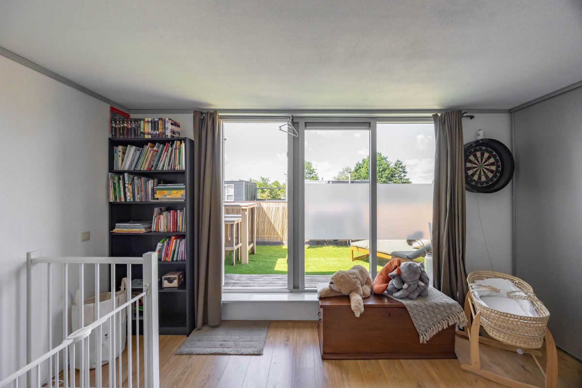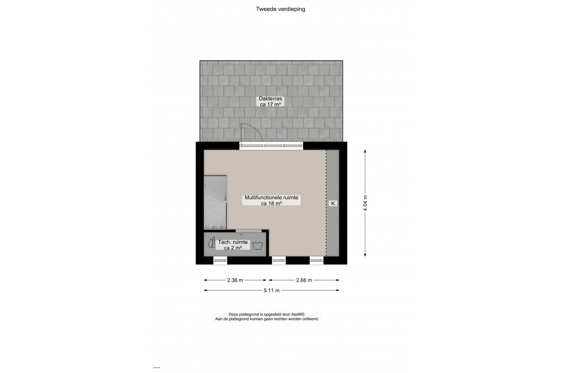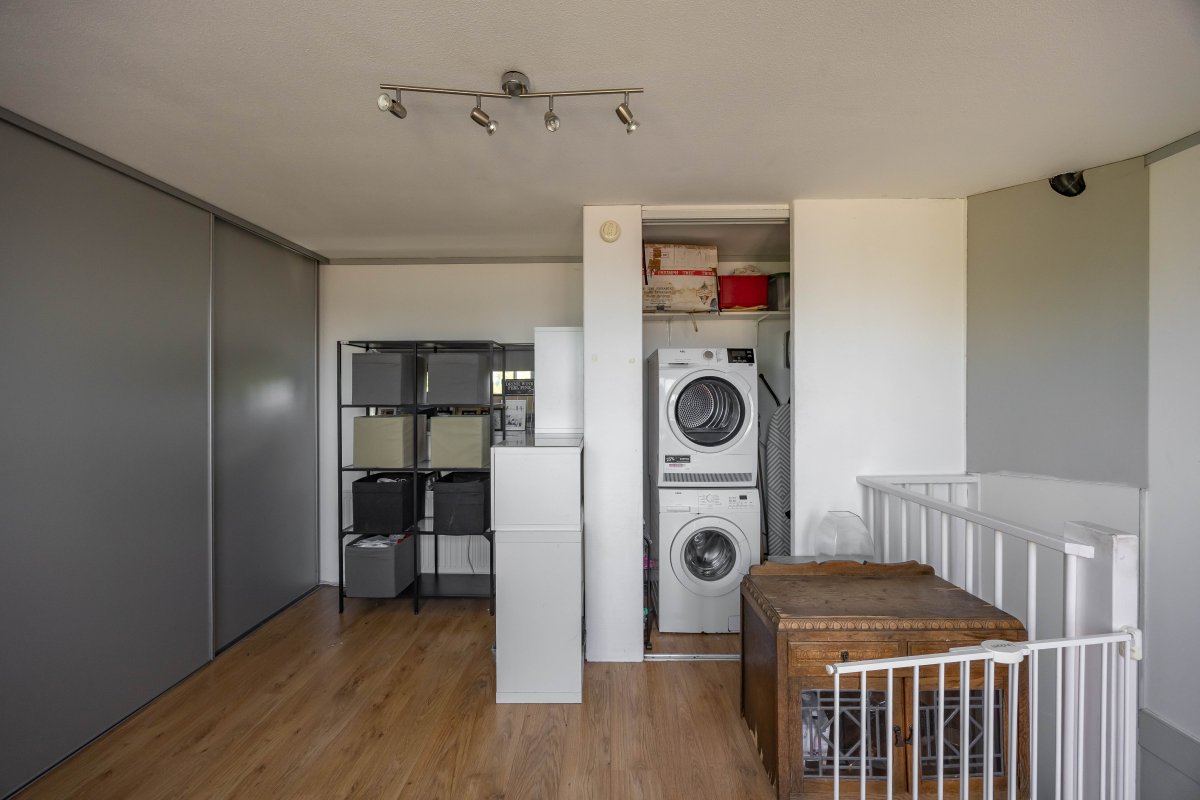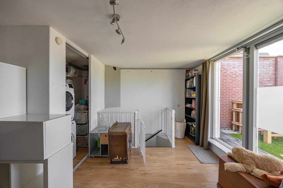 Tweede verdieping: Multifunctionele ruimte / vierde slaapkamer (circa 18 m²) met vaste kastenwand en toegang tot het ruime dakterras (circa 17 m²); technische ruimte met aansluitingen voor witgoed.