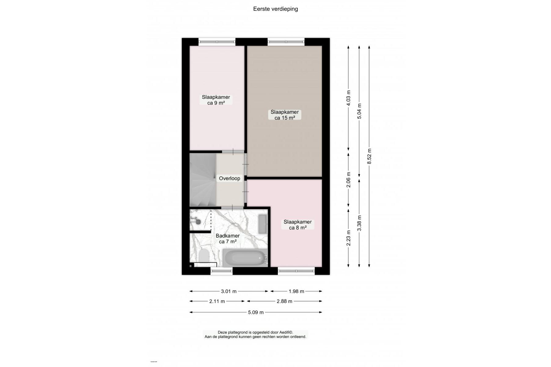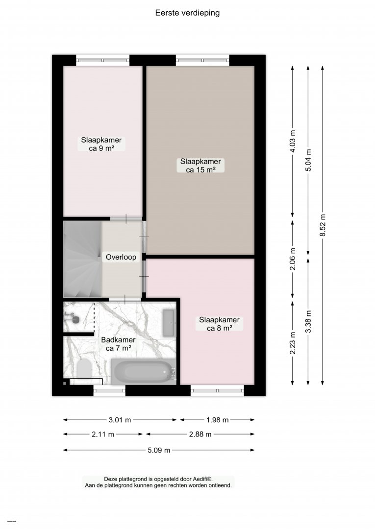 Eerste verdieping: Overloop; drie slaapkamers van circa 8 m², 9 m² en 15 m²; badkamer met ligbad, douche, wastafelmeubel en tweede toilet.