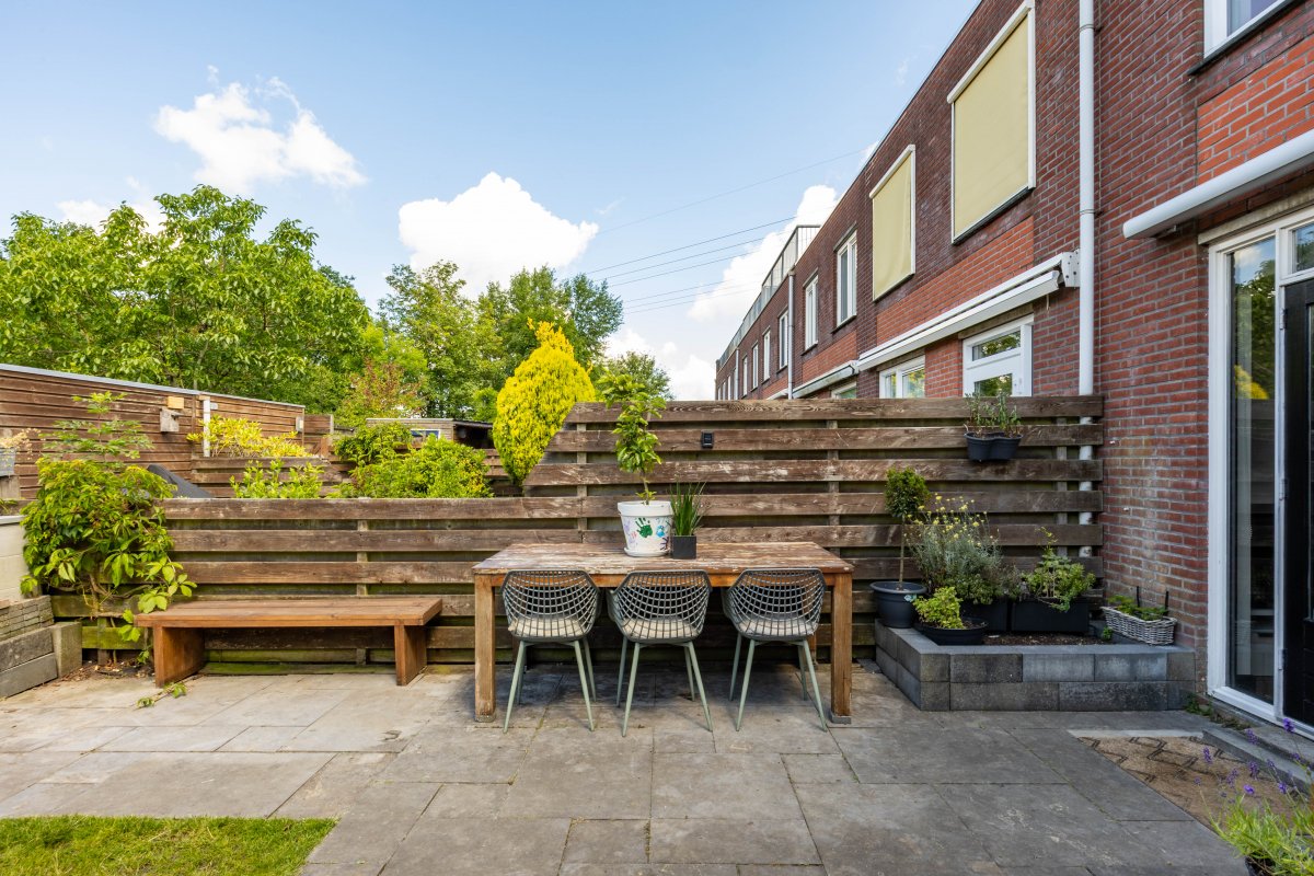 Zonnige tuin op het zuidwesten met berging en achterom.