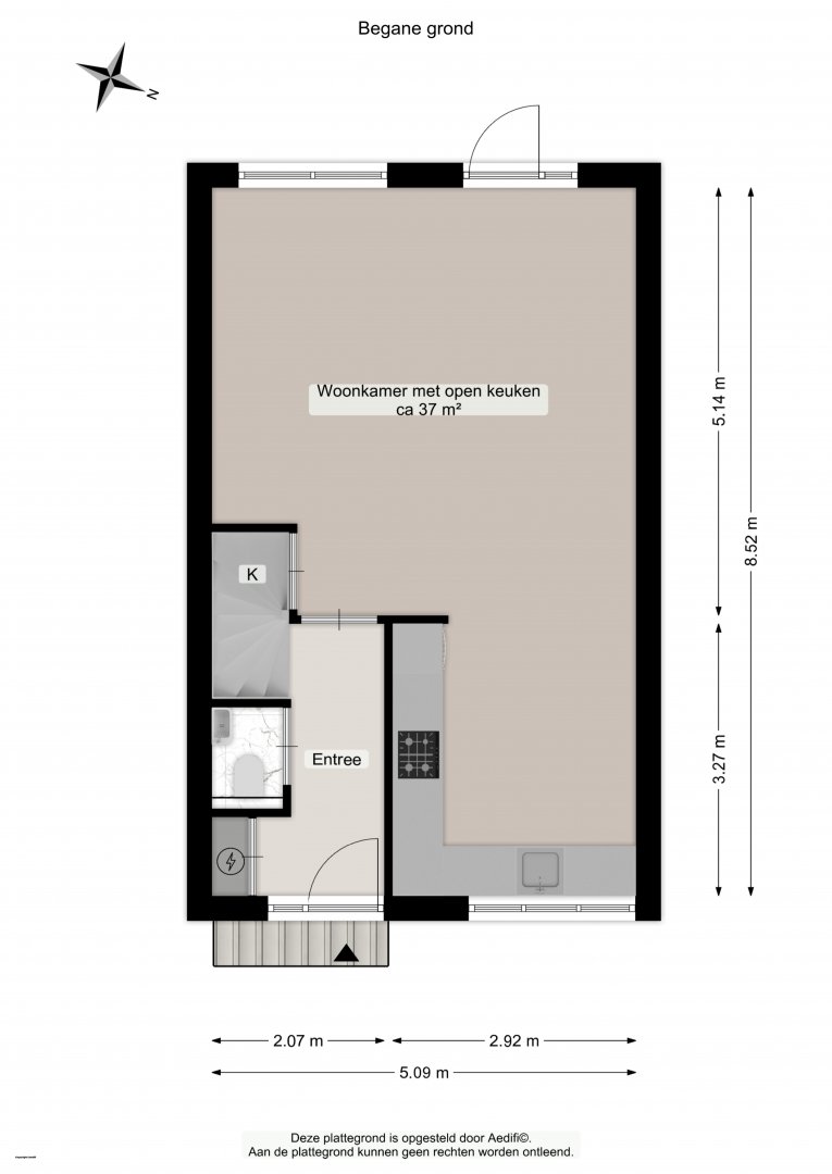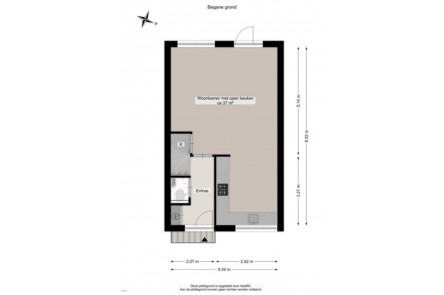 Begane grond: Entree/hal met toilet; lichte woonkamer met trapkast en open keuken; toegang tot de achtertuin.