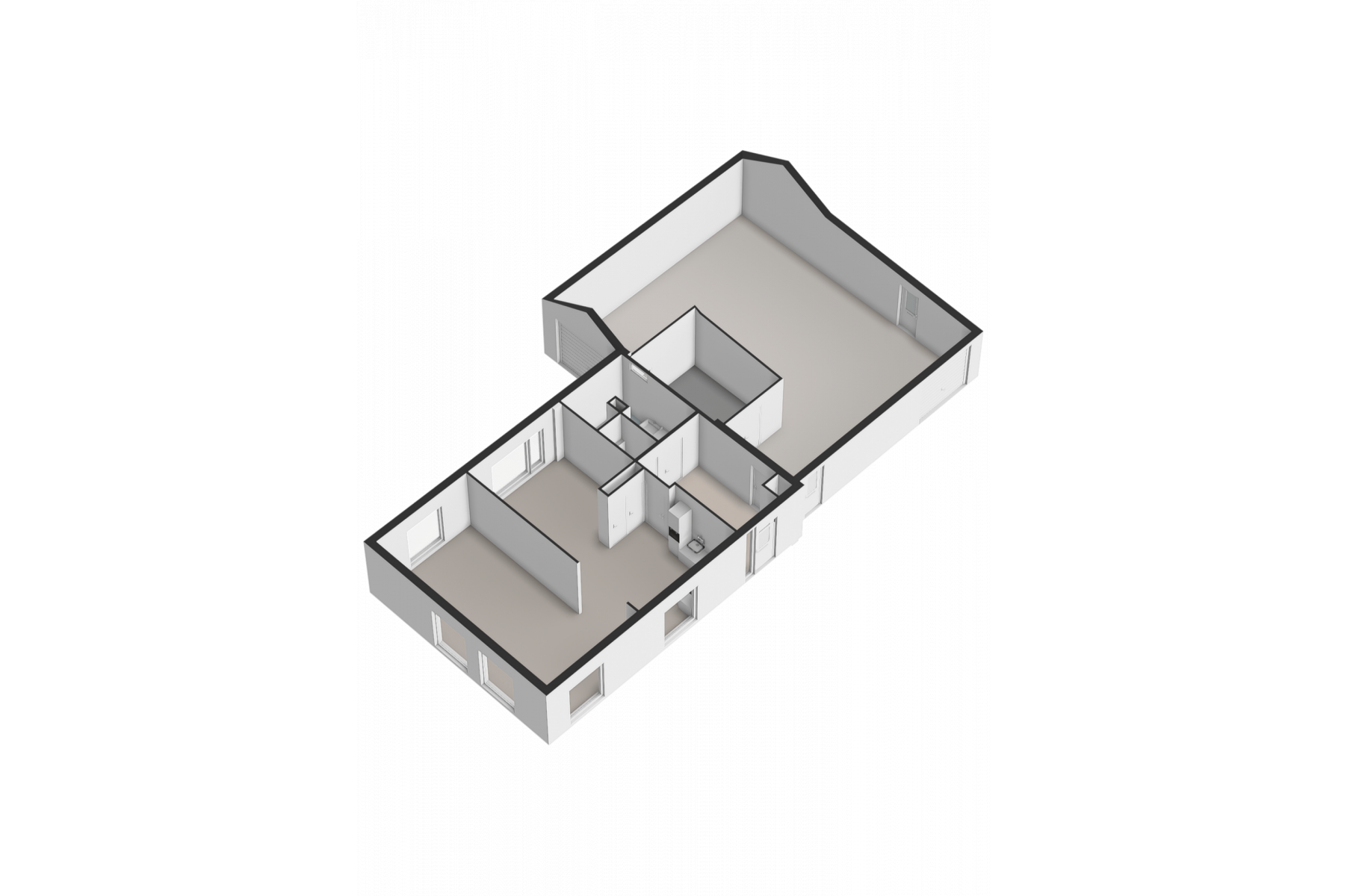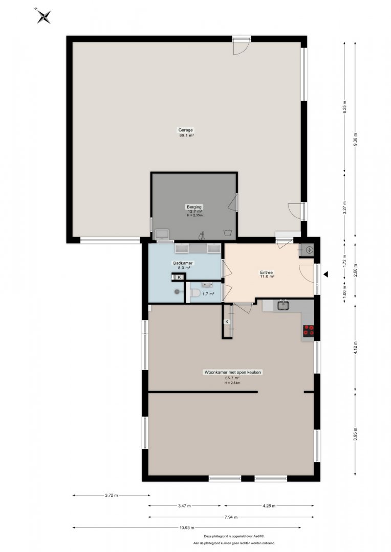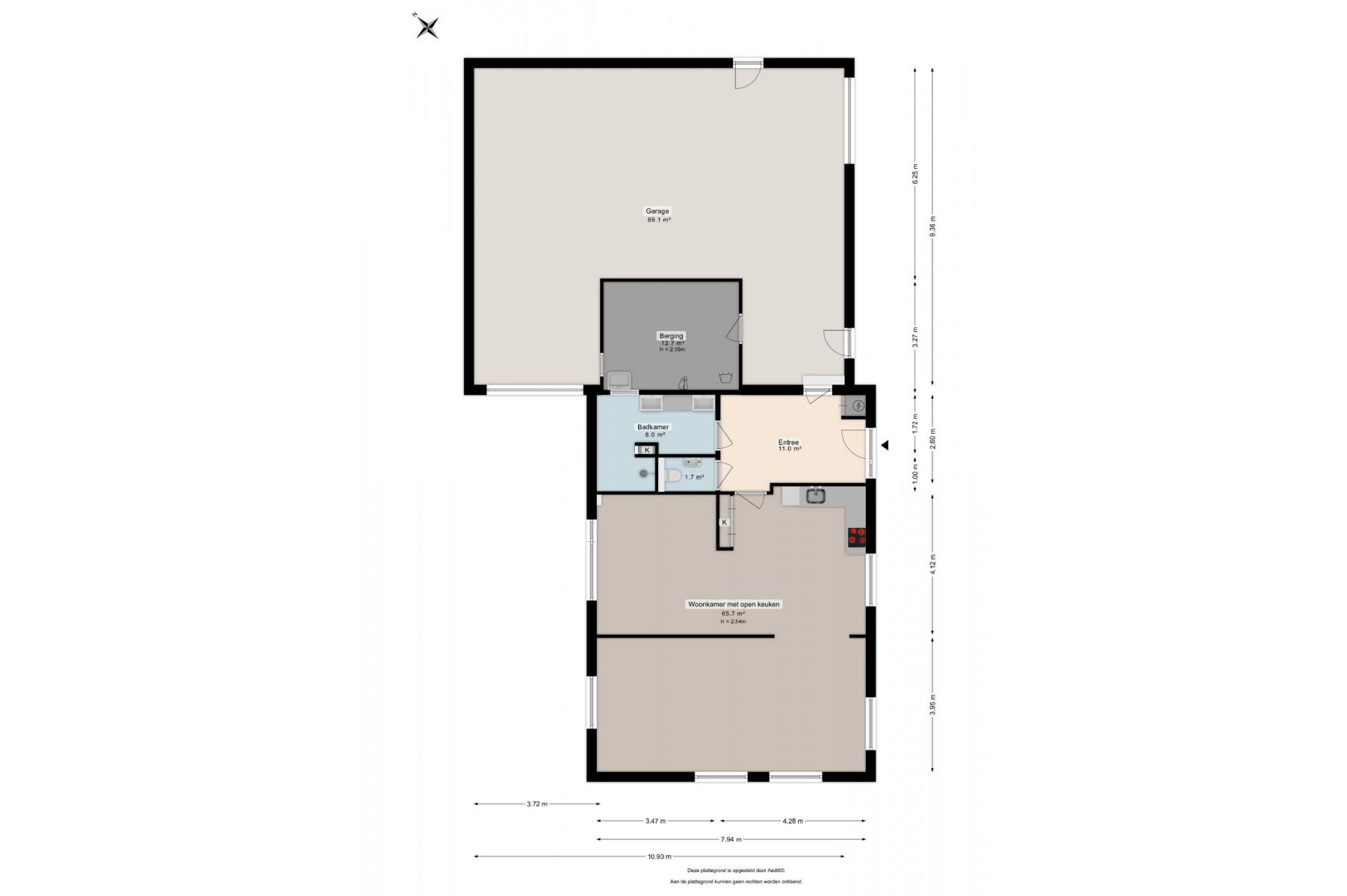 Begane grond: entree/hal; royale woonkamer met open keuken (ca. 66 m²); toilet; badkamer met stortdouche en dubbele wastafel; praktische bijkeuken met witgoedaansluitingen, stookruimte en uitstortgootsteen; garage/berging (ca. 89 m²).