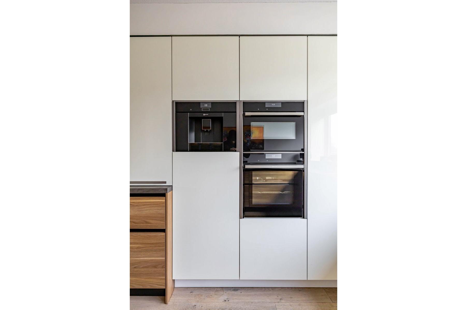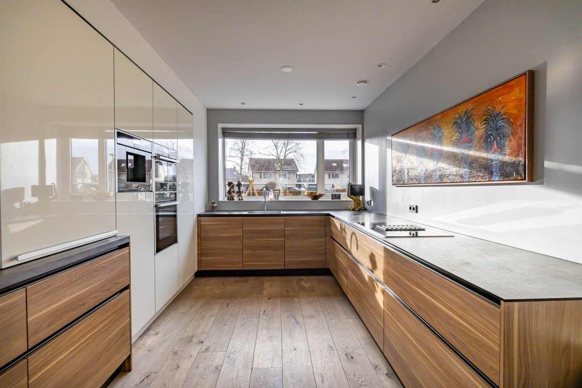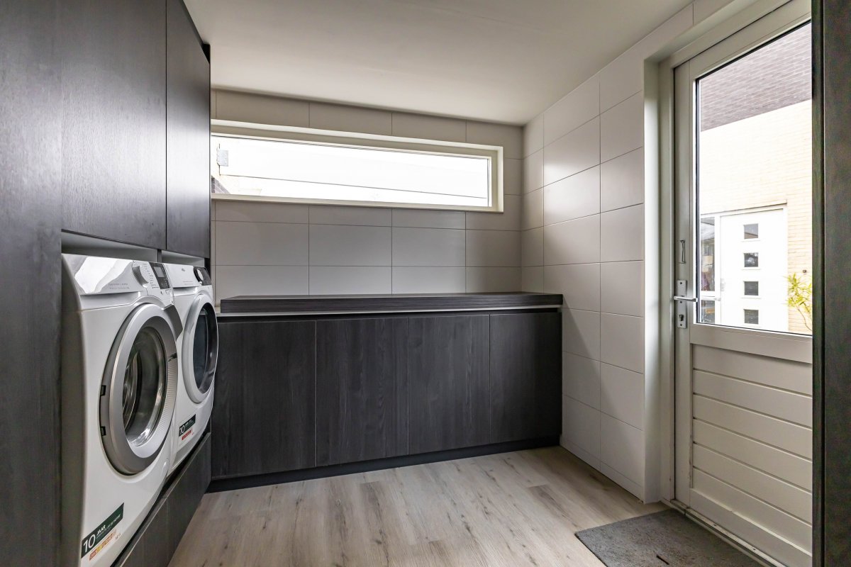 De super-de-luxe keuken (2018) is uitgevoerd met alle denkbare inbouwapparatuur van hoogwaardige kwaliteit en sluit perfect aan bij het moderne en luxe karakter van de woning. Ook de mooi verbouwde bijkeuken verdient vermelding, hier vind je de witgoedaansluitingen en praktische bergruimte.
