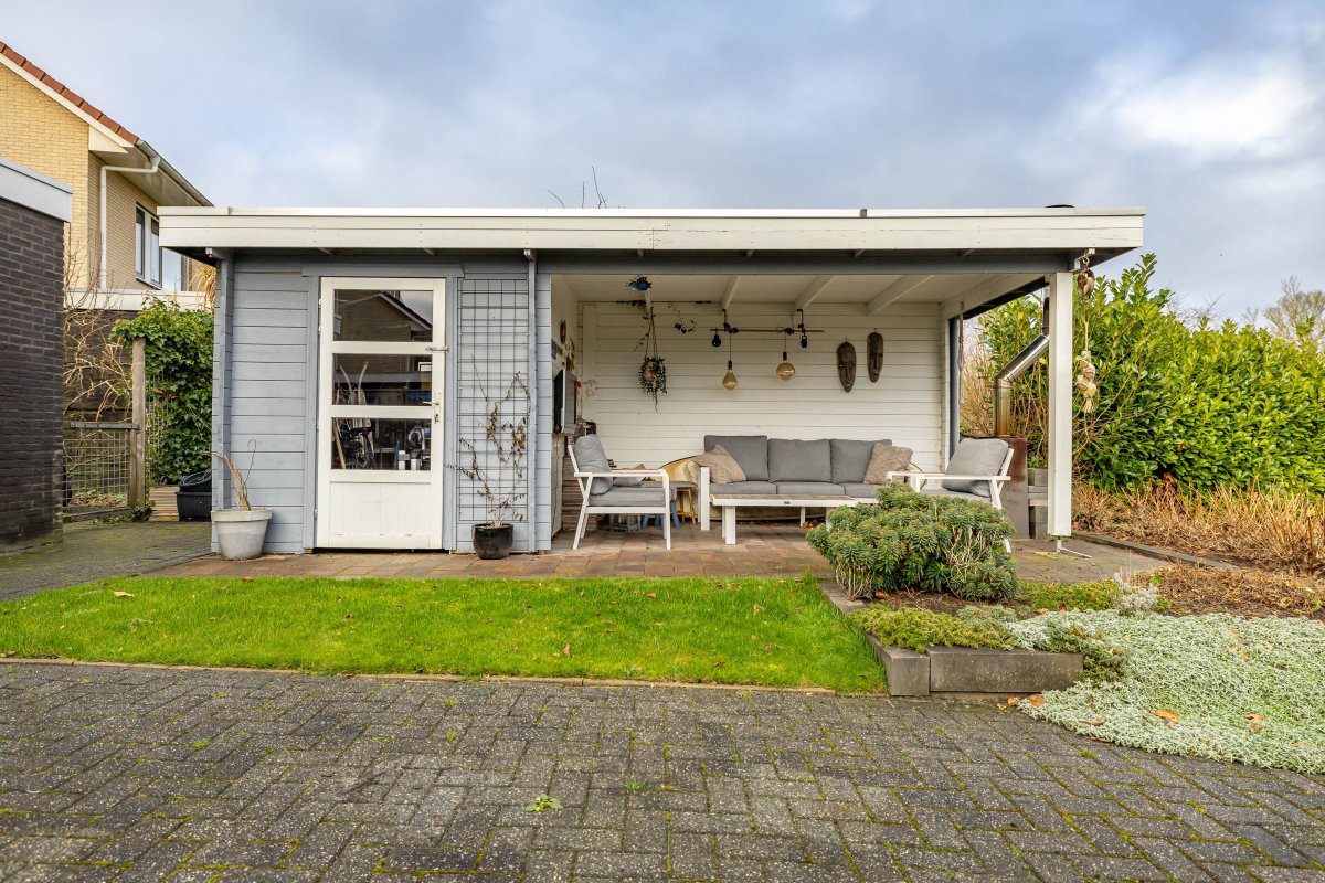 - houten berging en overkapping in achtertuin