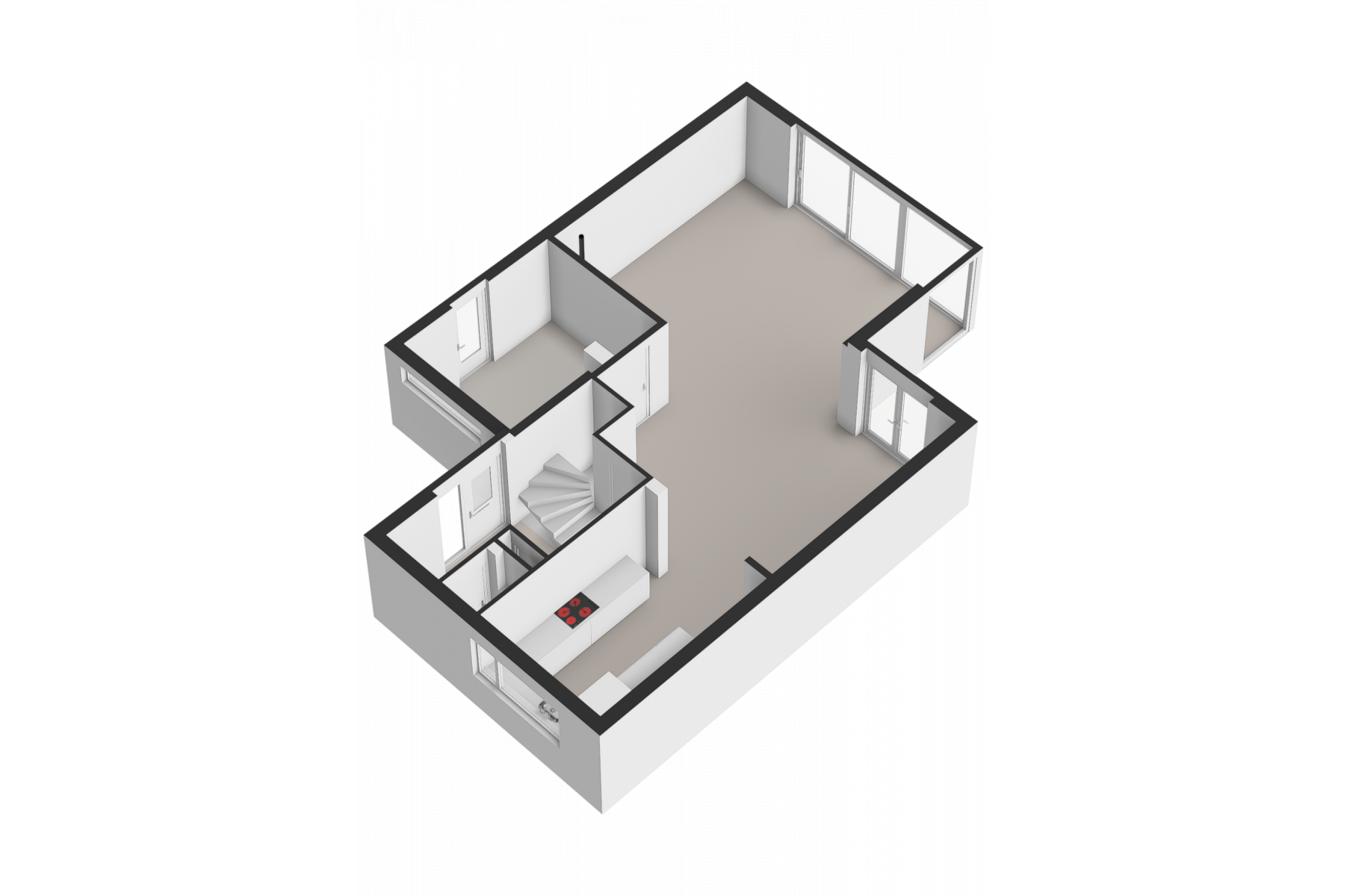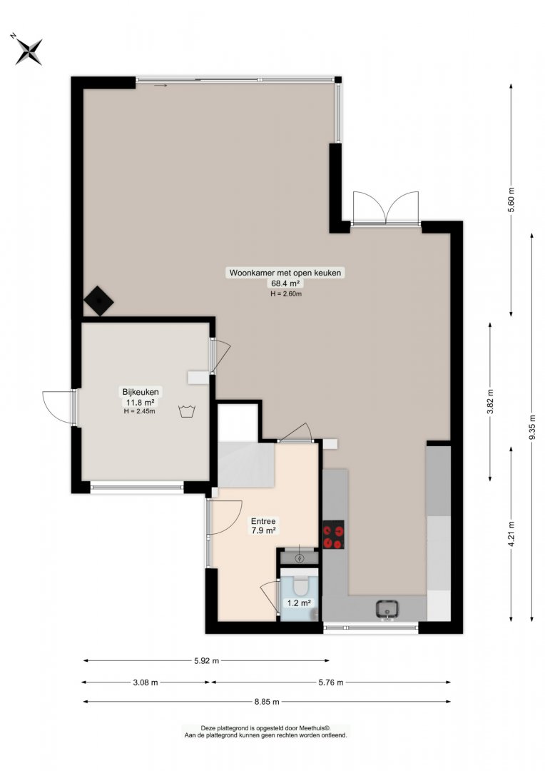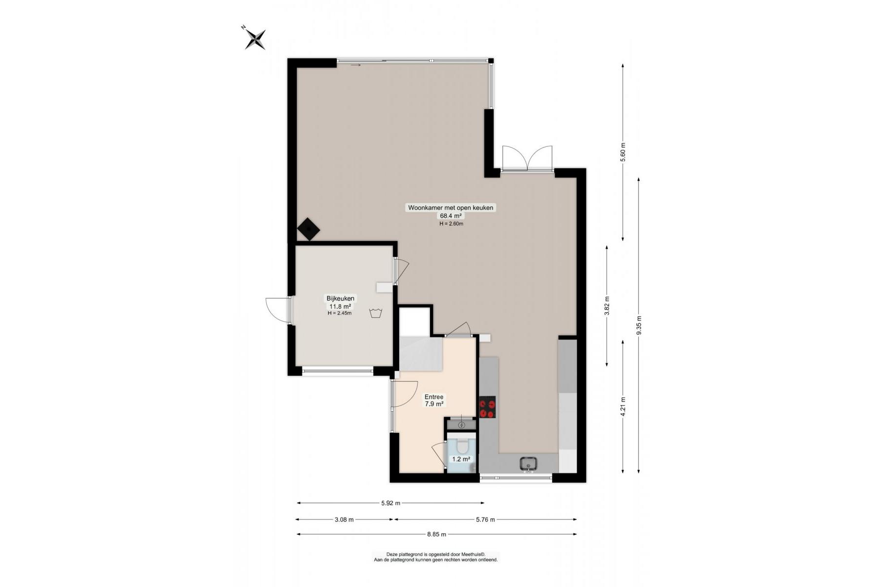 hal/entree; toiletruimte; woonkamer met open keuken, totaal circa 68 m²; bijkeuken van circa 12 m²;