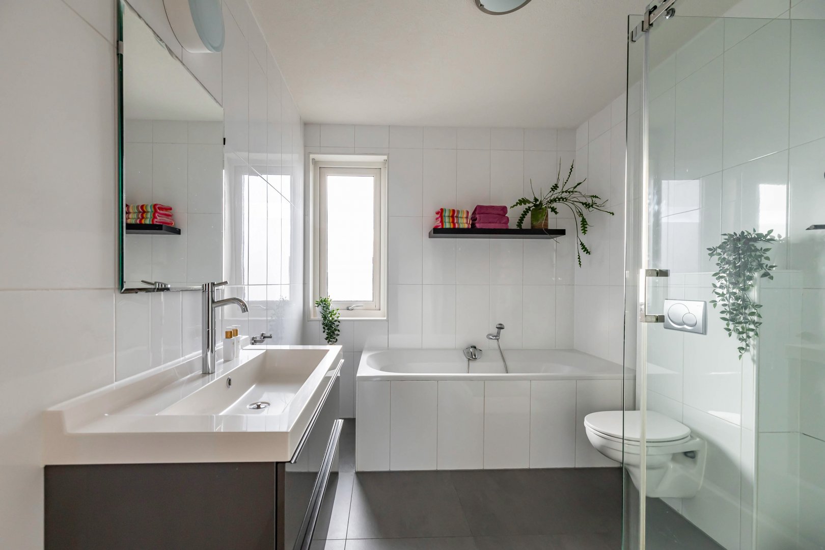 overloop; drie slaapkamers van respectievelijk circa 8, 14 en 16 m²; badkamer met ligbad, douche, toilet, badkamermeubel;