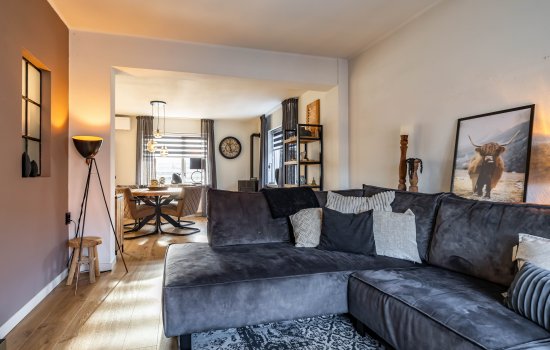 De woning is modern uitgevoerd en goed onderhouden, met strak stuc- en schilderwerk, stijlvolle raambekleding en nieuwe laminaatvloeren in houtdesign. De ruime, tuingerichte eetkamer staat in open verbinding met de keuken en beschikt over nieuwe openslaande deuren, waarmee je eenvoudig het beschutte, volledig verharde terras op het zuiden betreedt.