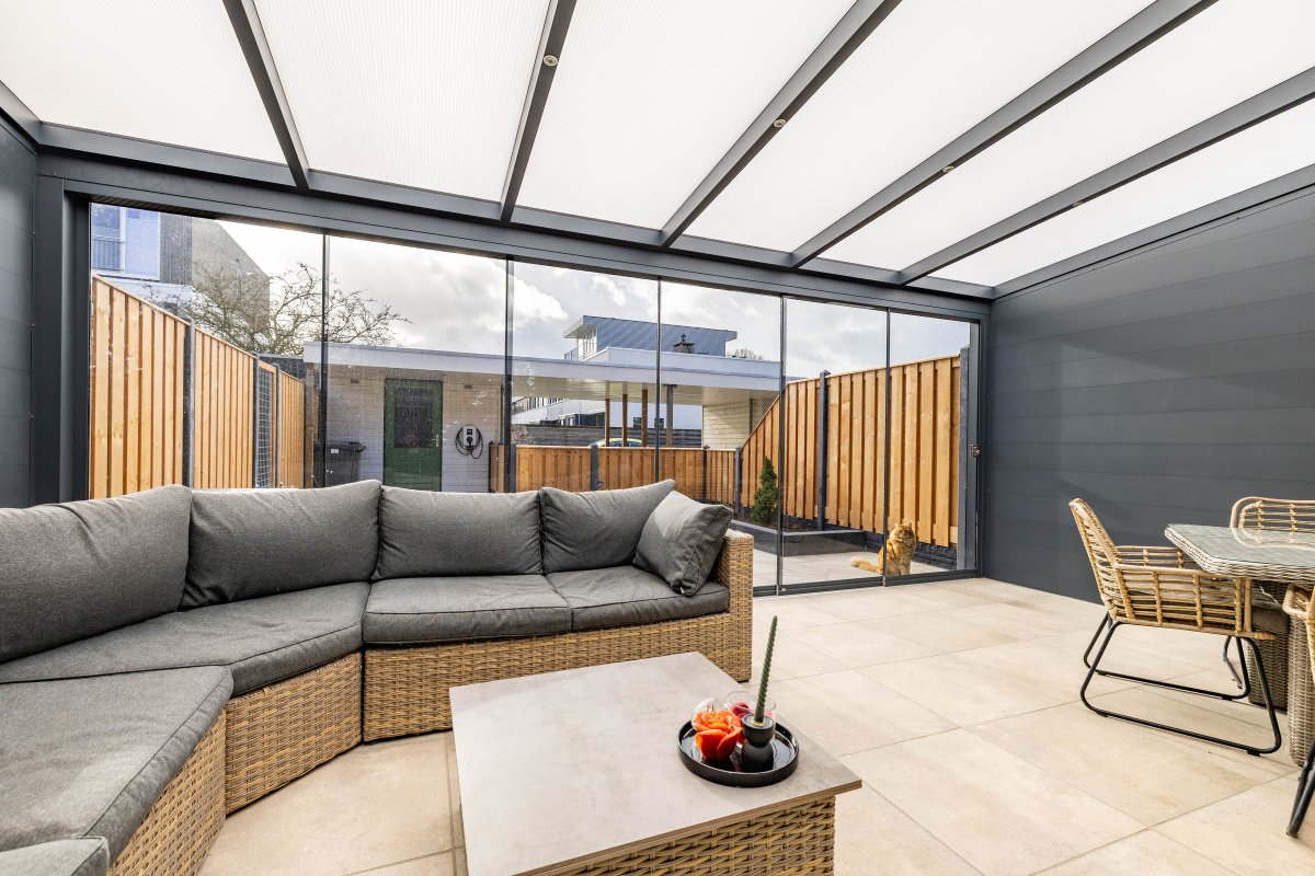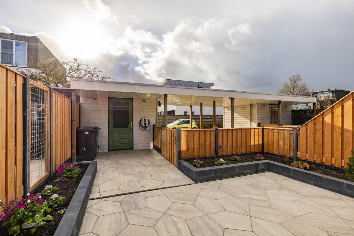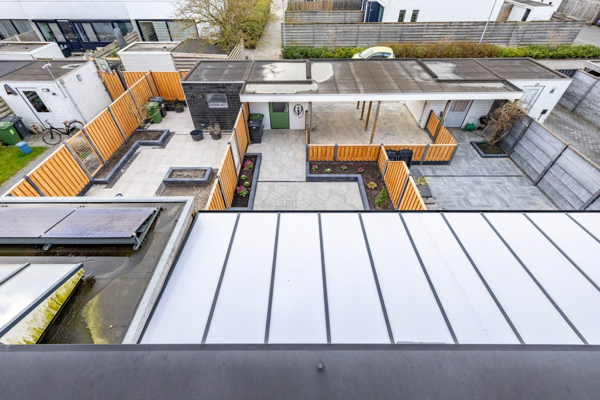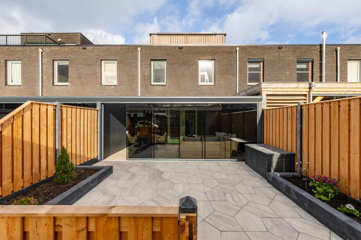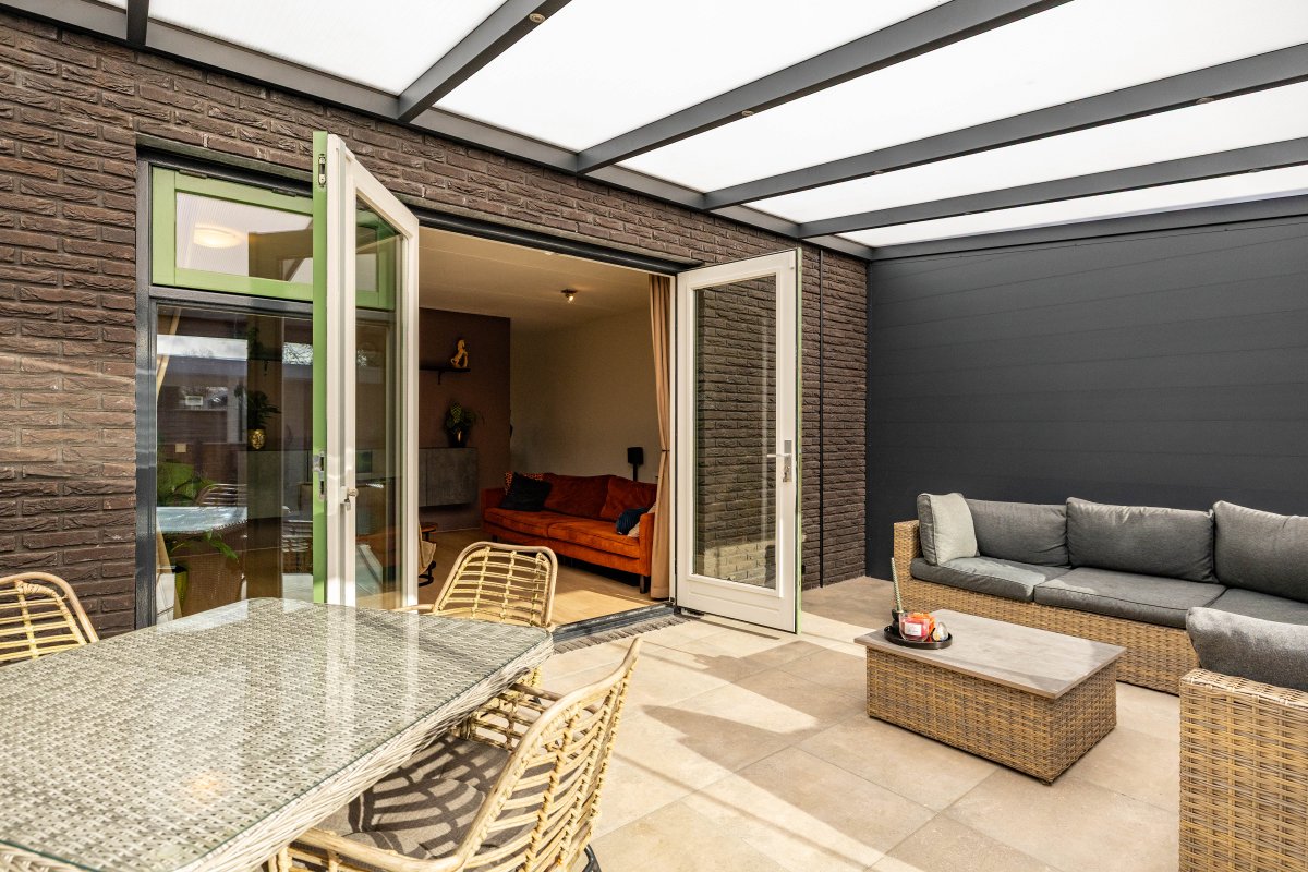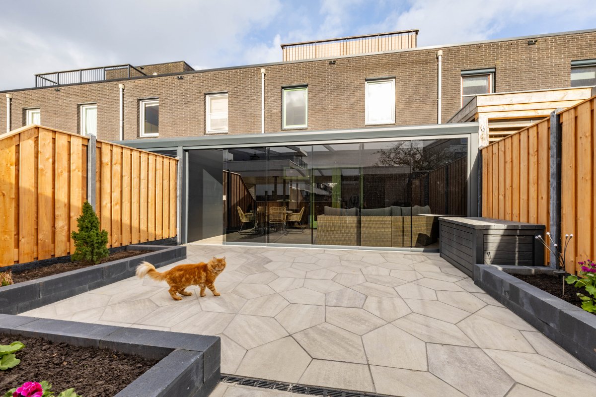 De recent aangelegde achtertuin (2025) is verzorgd en voorzien van een veranda, waardoor je het hele jaar door buiten kunt zitten. De serre zorgt voor een mooie verbinding tussen binnen en buiten.