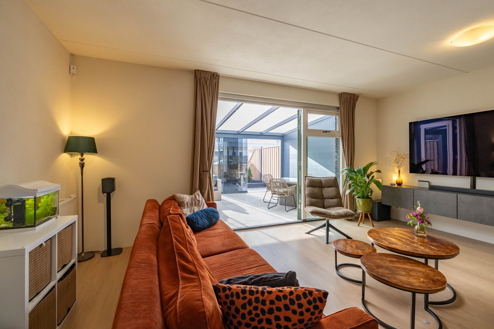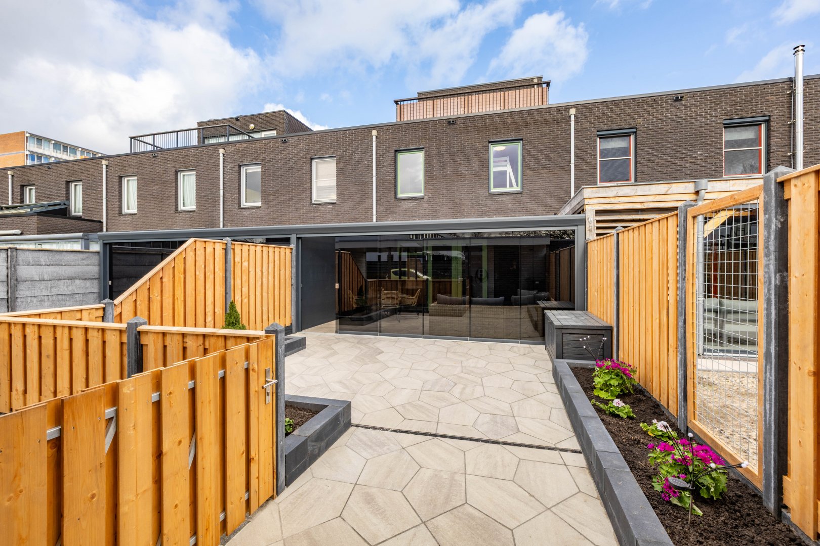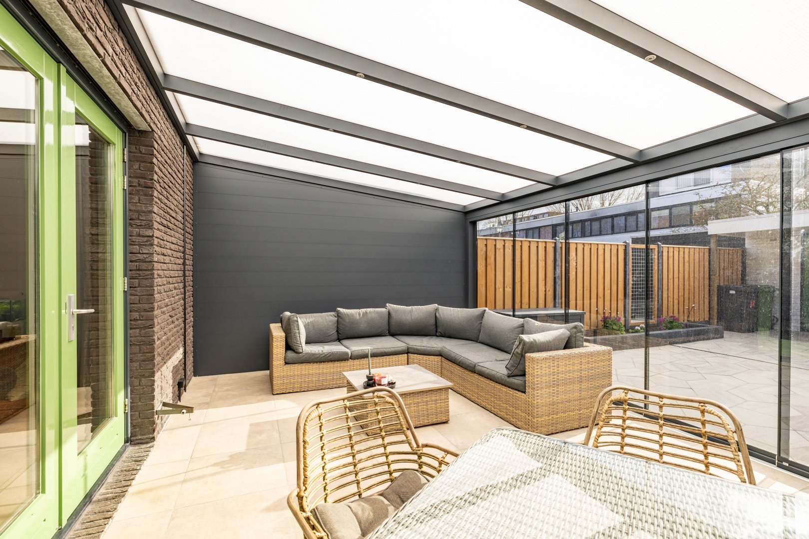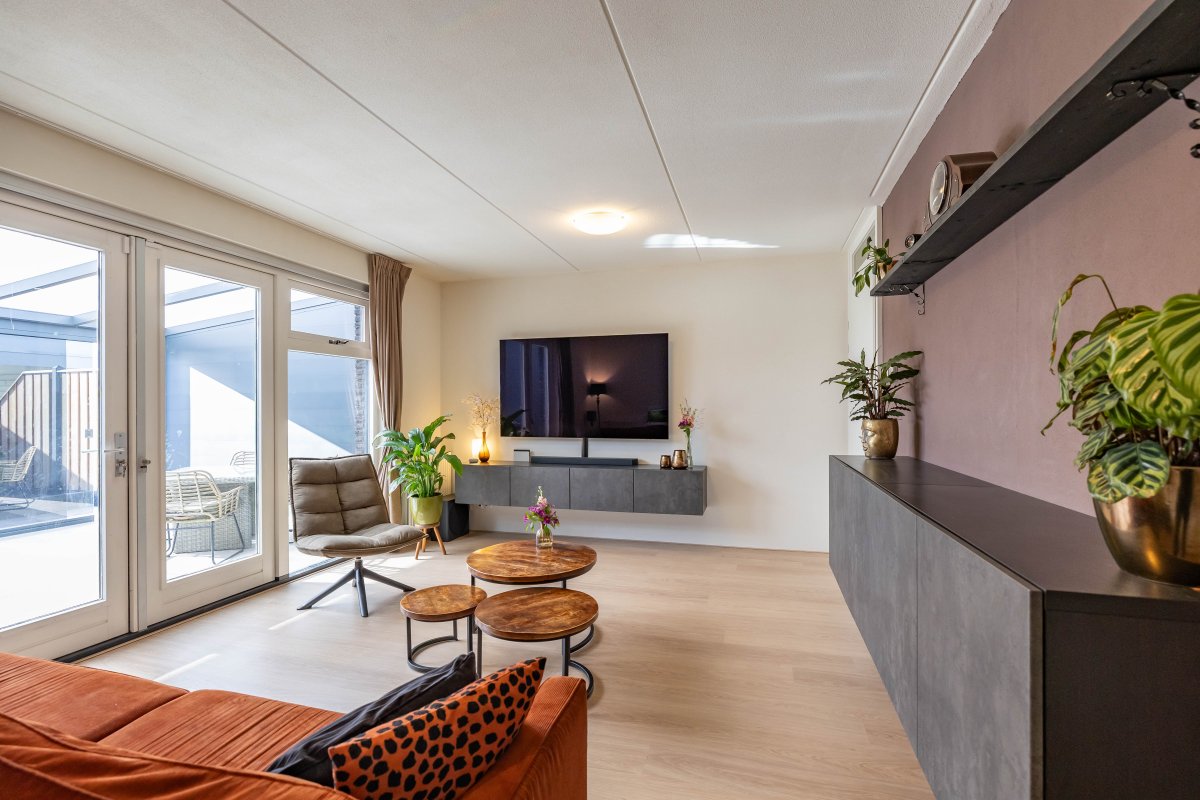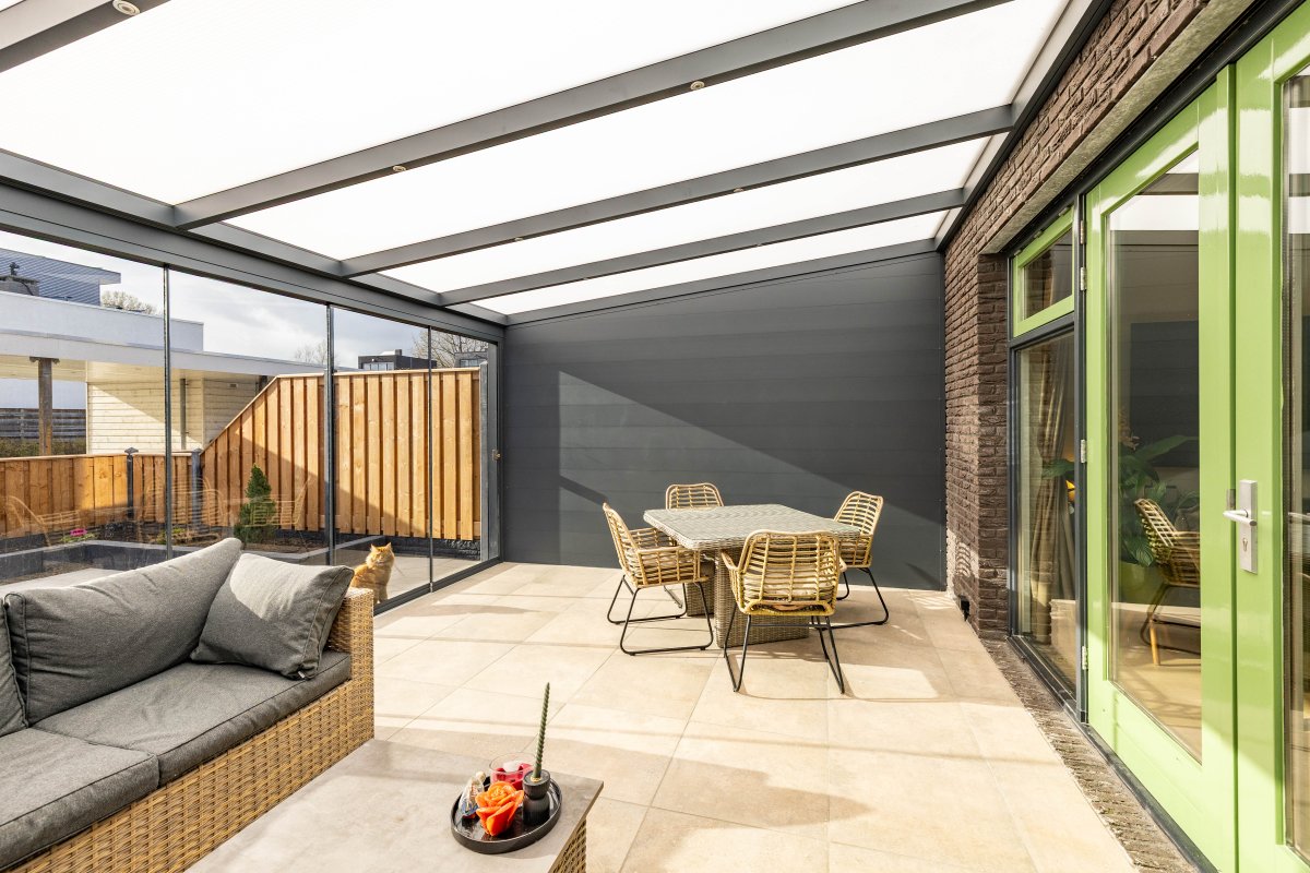 De recent aangelegde achtertuin (2025) is verzorgd en voorzien van een veranda, waardoor je het hele jaar door buiten kunt zitten. De serre zorgt voor een mooie verbinding tussen binnen en buiten.