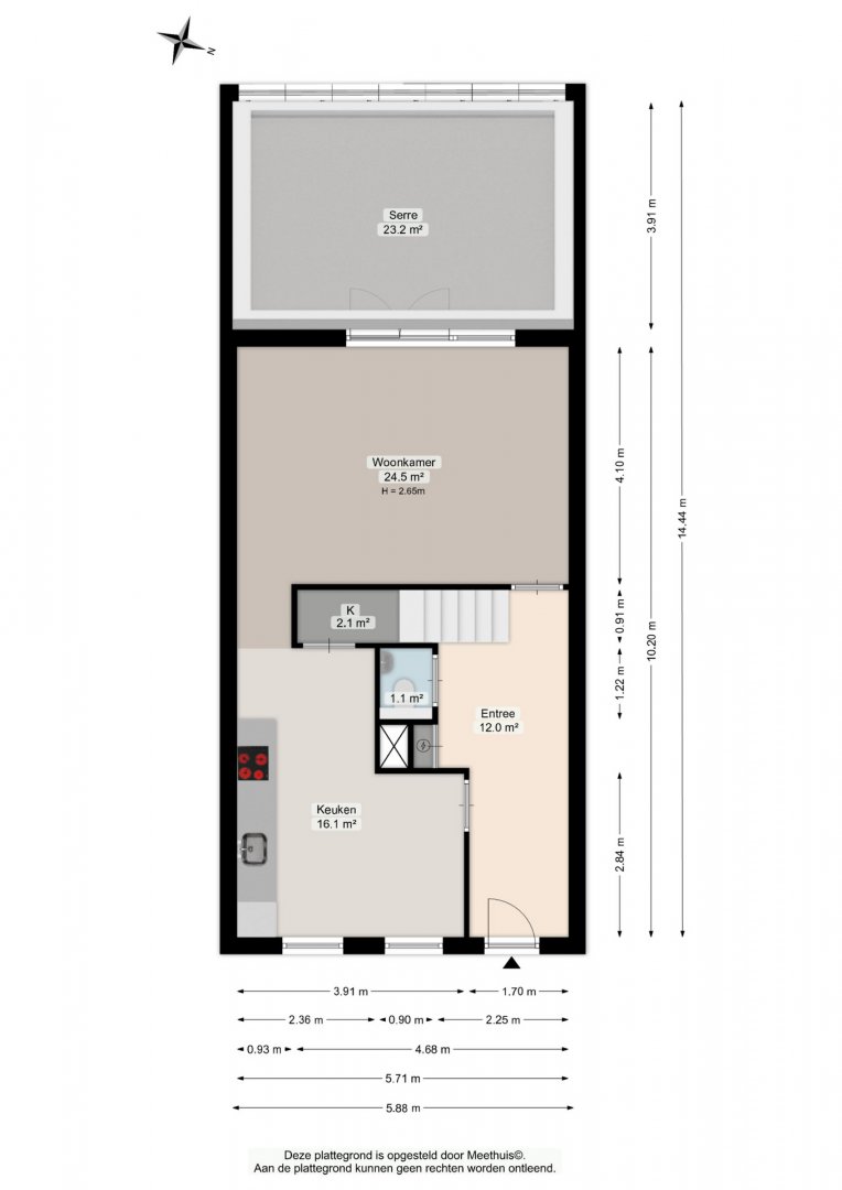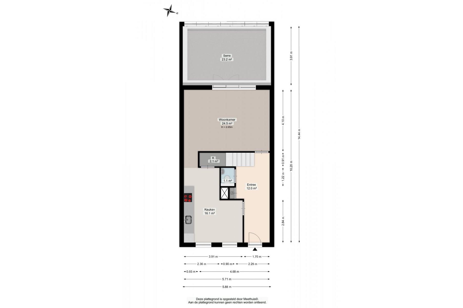 Entree/hal; toilet; vanuit de hal toegang tot de woonkeuken (circa 16 m²) met luxe keuken; tuingerichte woonkamer van circa 25 m²; De serre (23 m²) vormt een verlengstuk van de woonkamer en biedt een mooie overgang naar de achtertuin.