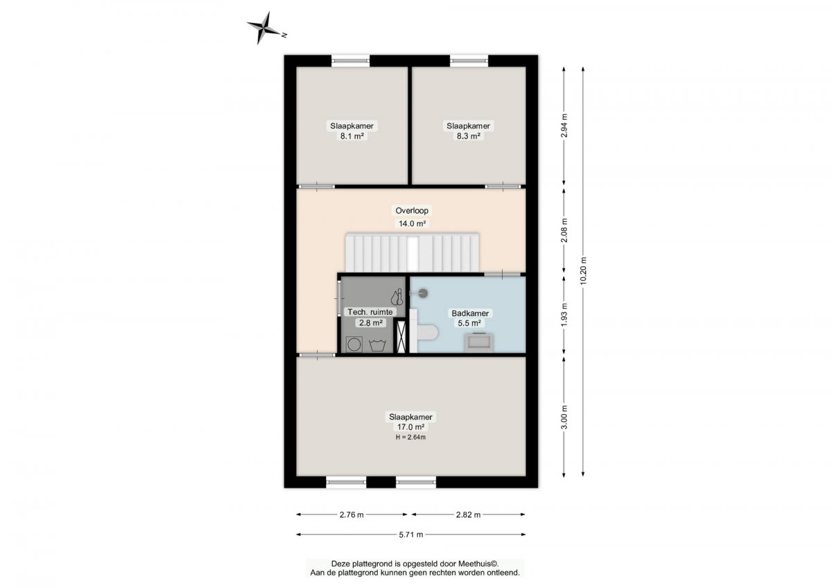 overloop; drie slaapkamers van circa 8, 8 en 17 m²; badkamer (2026); technische ruimte met witgoedaansluiting en c.v. ketel;