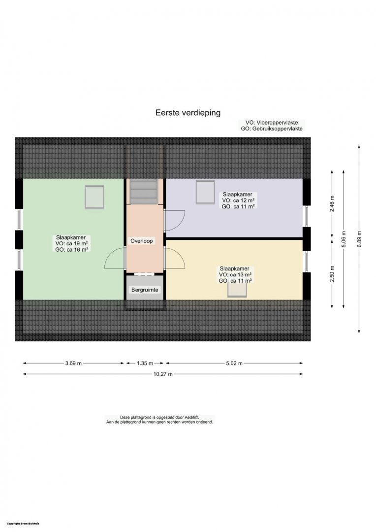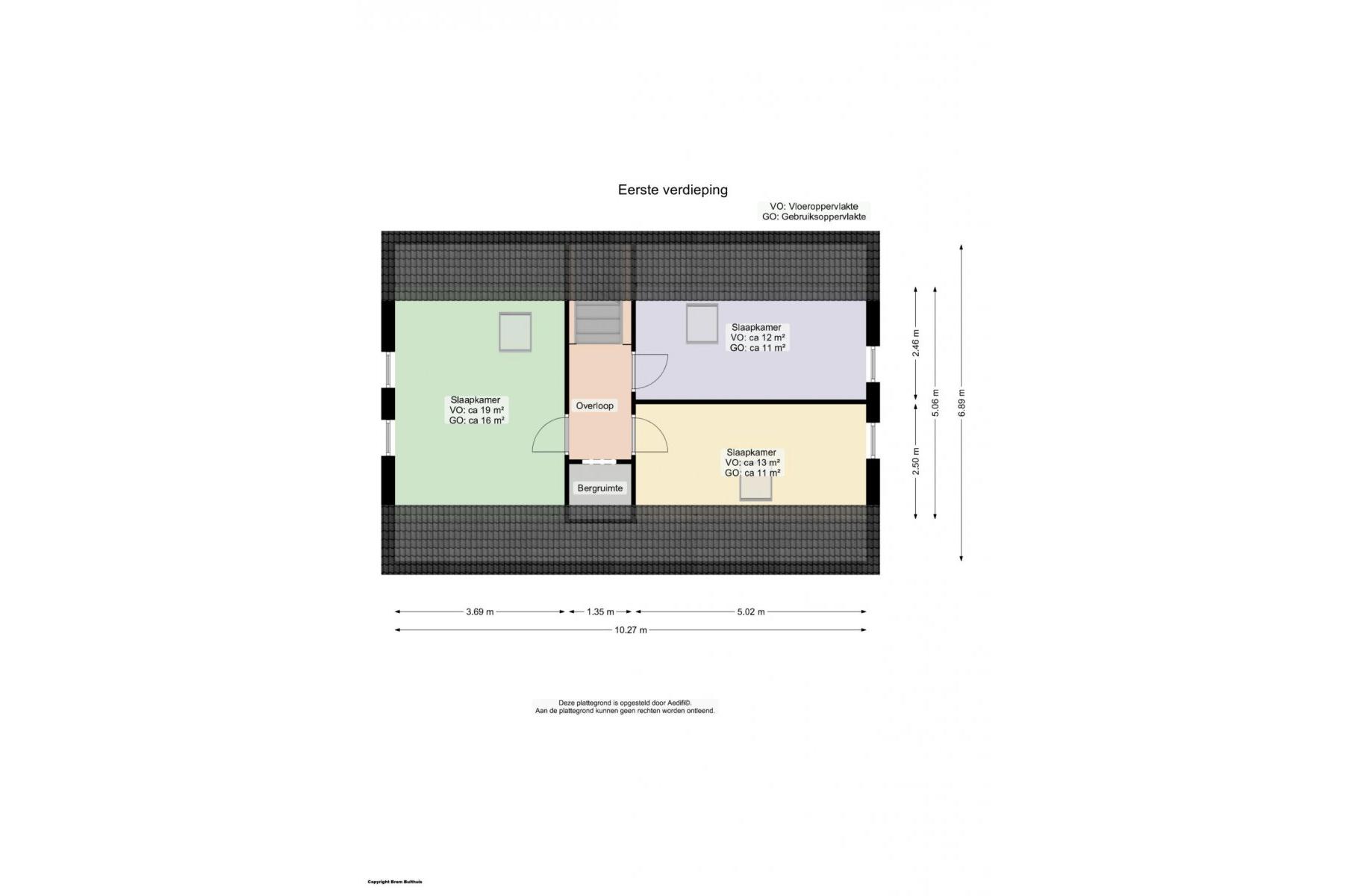 Overloop; bergruimte; 3 slaapkamers van respectievelijk 11m², 11m² en 16 m² (op 1,5 m gemeten, vloeroppervlakte iets groter)