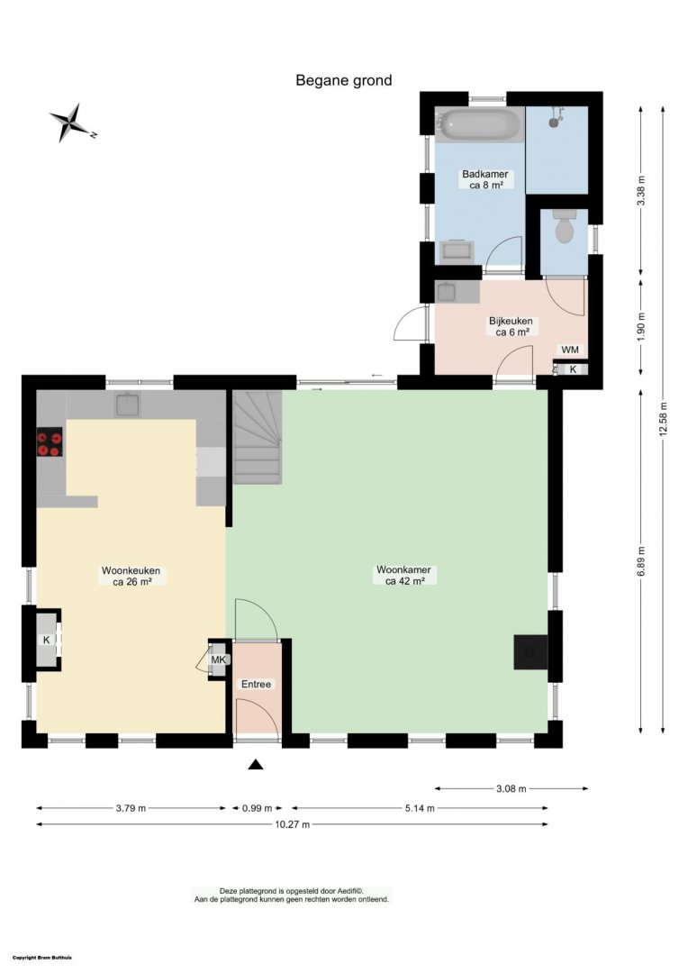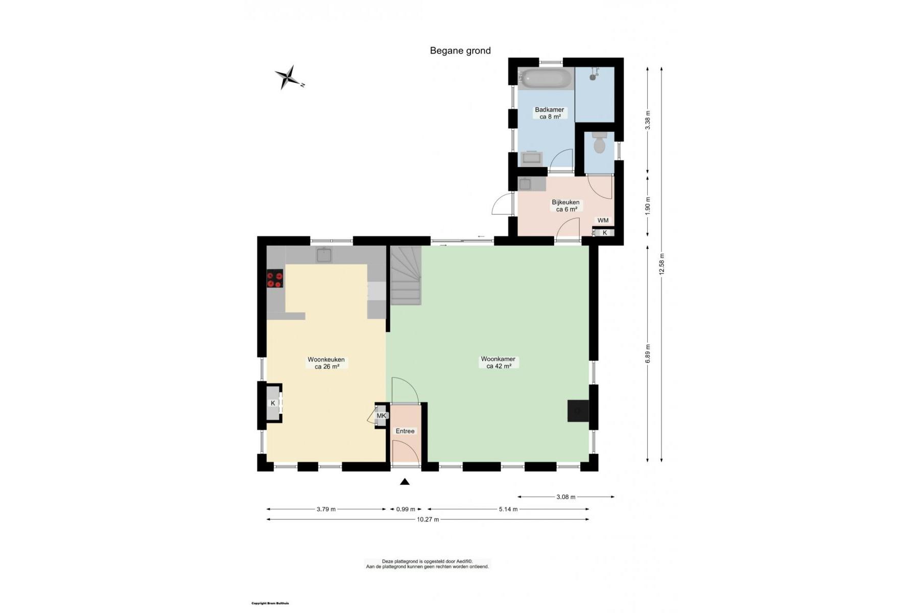 Entree; woonkamer en woonkeuken (samen 68 m²) ; bijkeuken met achter entree; toilet; luxe badkamer met wastafelmeubel, inloopdouche en ligbad.
