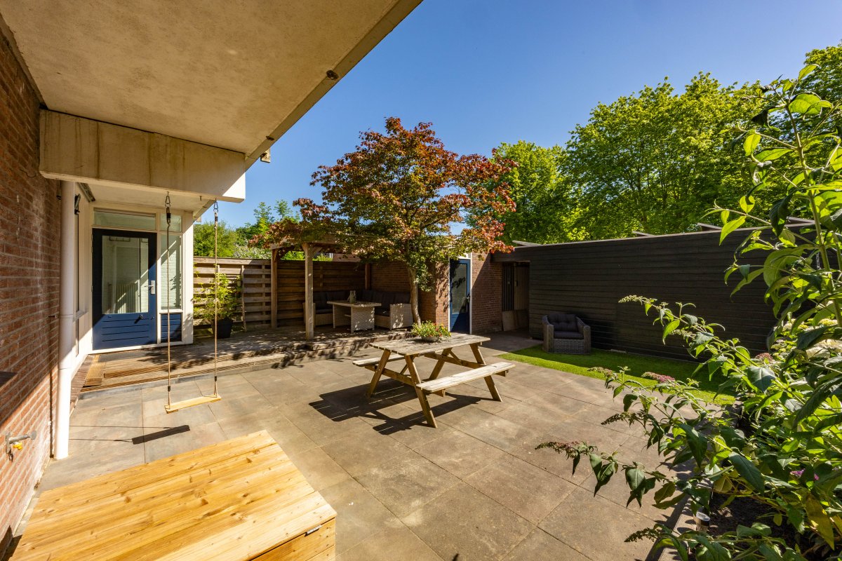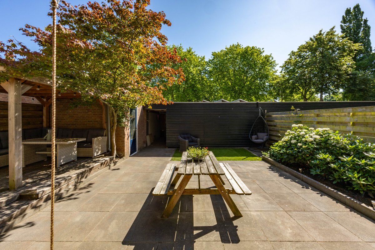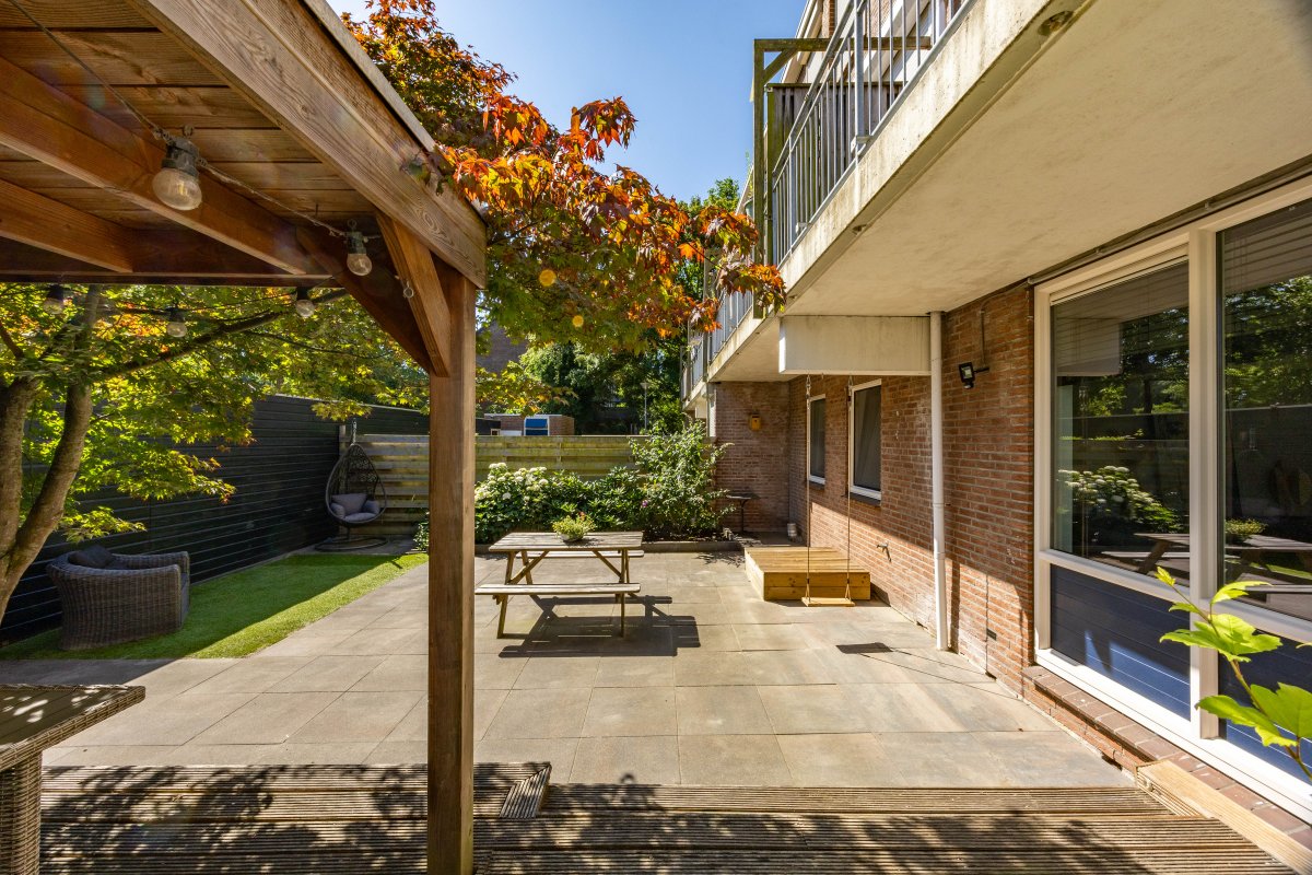 De achtertuin is onderhoudsvrij, heeft een gezellig terras met overkapping en geeft toegang tot een stenen berging en een afgesloten carport in gebruik als garageruimte. In vergelijk tot andere appartementen is hier uitzonderlijk veel bergruimte aanwezig!