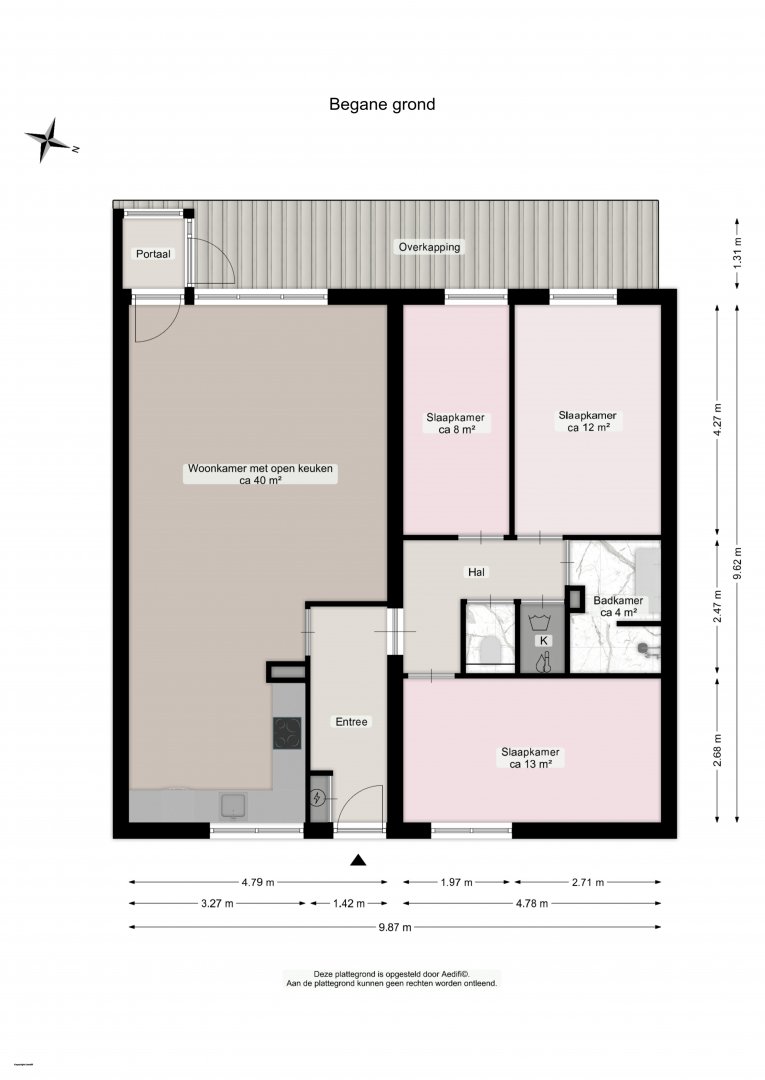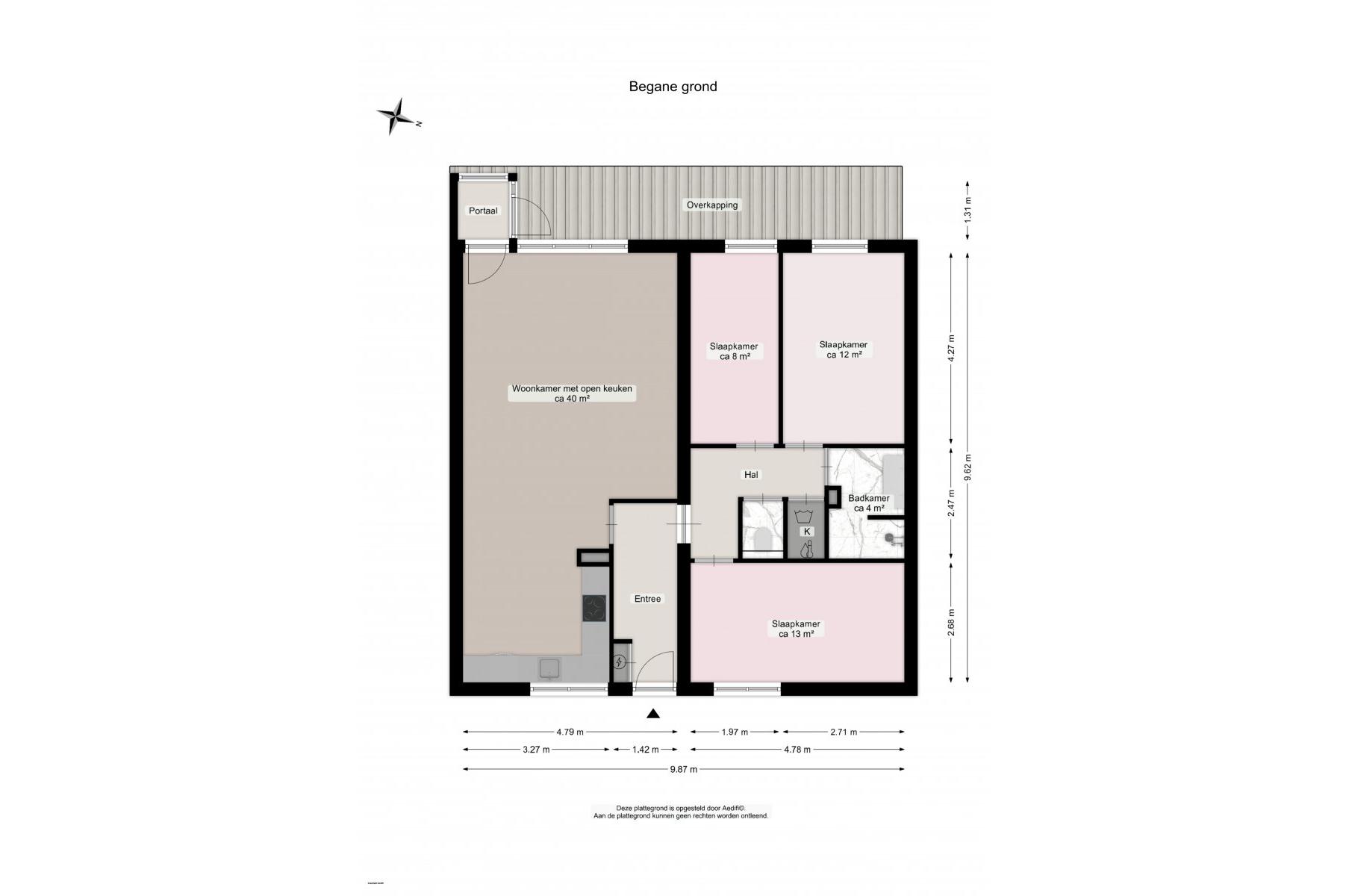 hal/entree; riante woonkamer met open keuken, totaal circa 40 m²; via tochtportaal toegang tot de achtertuin; tussenhal met daaraan het toilet; drie ruime slaapkamers van respectievelijk 8, 12 en 13 m²; badkamer met douchevoorziening en badkamermeubel.