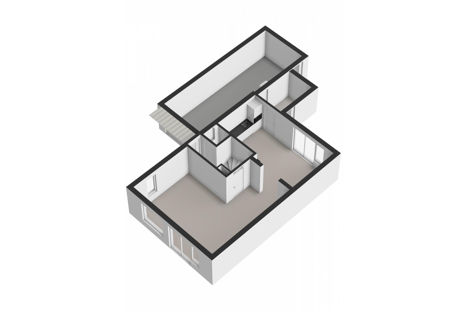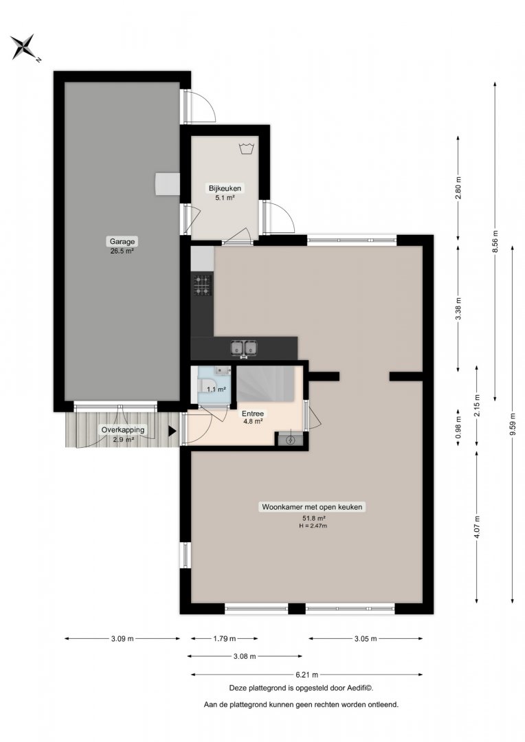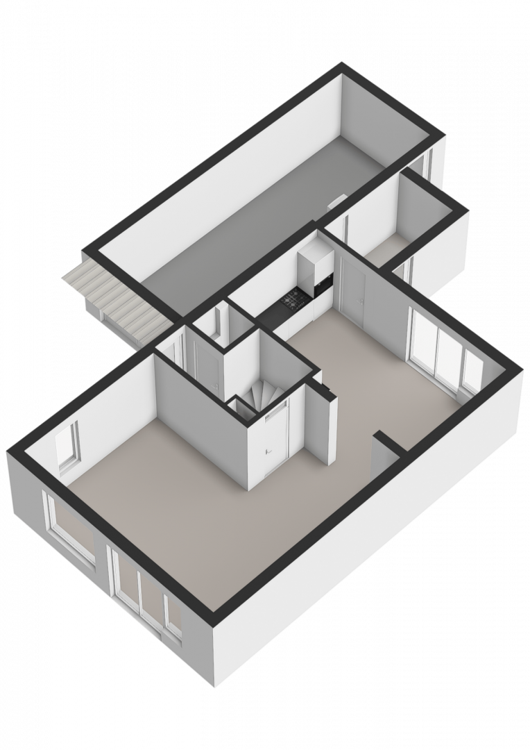 hal/entree; toiletruimte met vernieuwd toilet; zeer ruime woonkamer met half-open keuken, totaal circa 52 m²; bijkeuken met witgoedaansluiting; vanuit de bijkeuken toegang tot de extra diepe garage (8,50 meter);